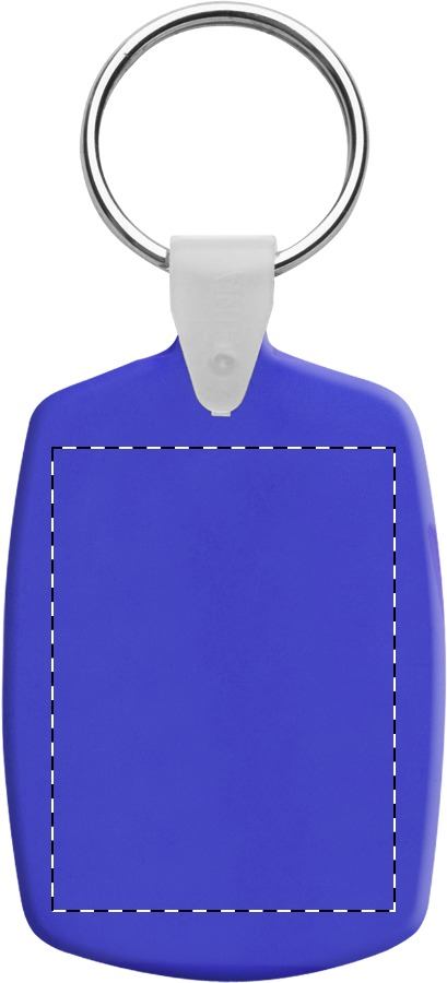 Rechteckiger Schlüsselanhänger aus Kunststoff mit Metall-Schlüsselring.
