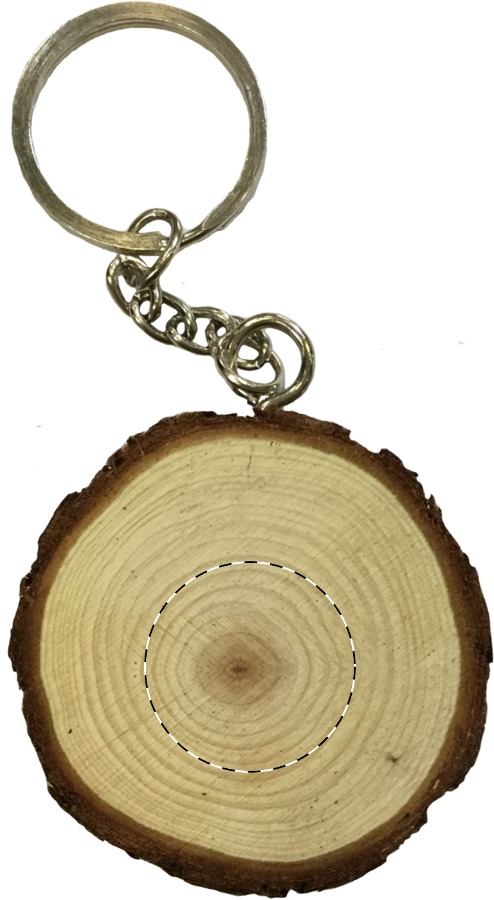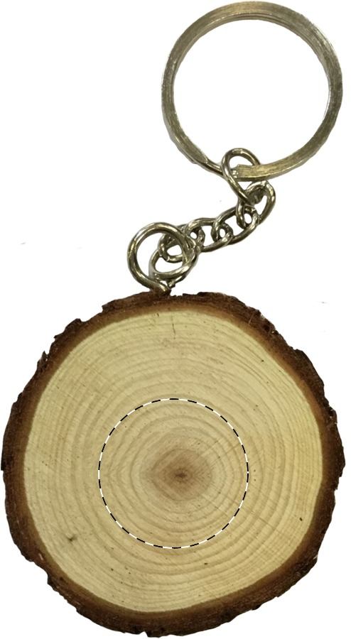 Schlüsselanhänger aus Kiefernholz mit Borke und Metallring. Die Größe kann von Stück zu Stück variieren.