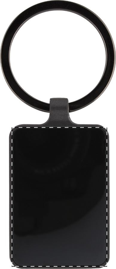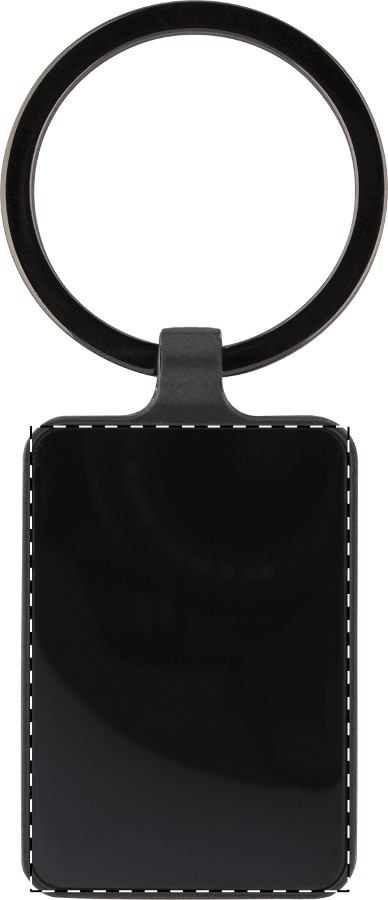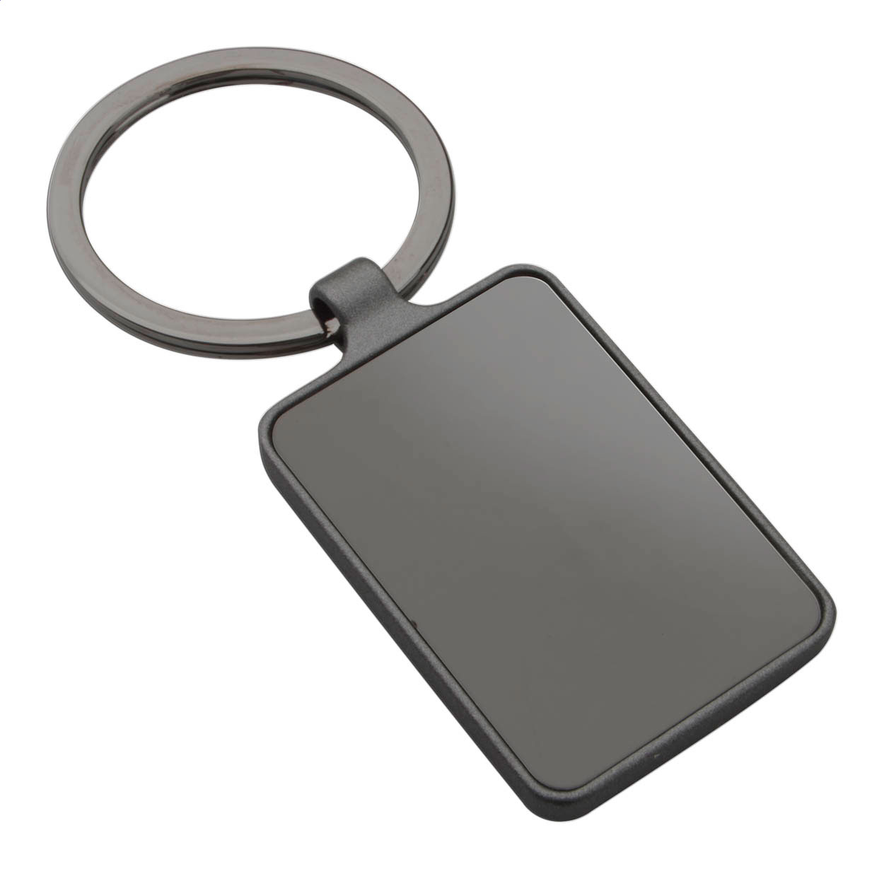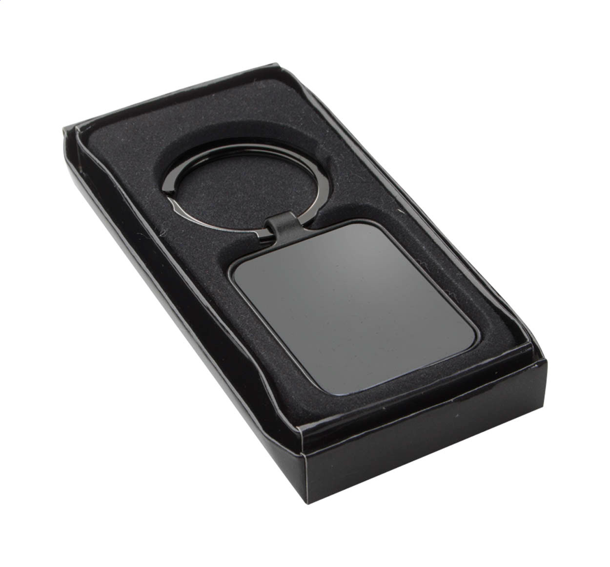 Rechteckiger Schlüsselanhänger aus Metall mit Gun-Metal-Oberfläche und polierten Plättchen auf beiden Seiten. Einzeln in schwarzer Geschenkbox.