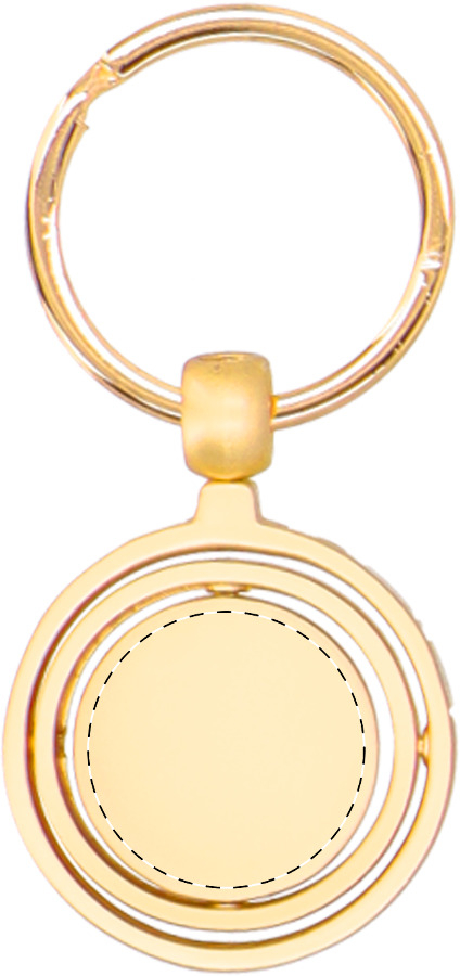 Metallschlüsselanhänger mit goldfarbener Oberfläche und rotierenden Innenteilen. Einzeln in Kraftpapierbox.