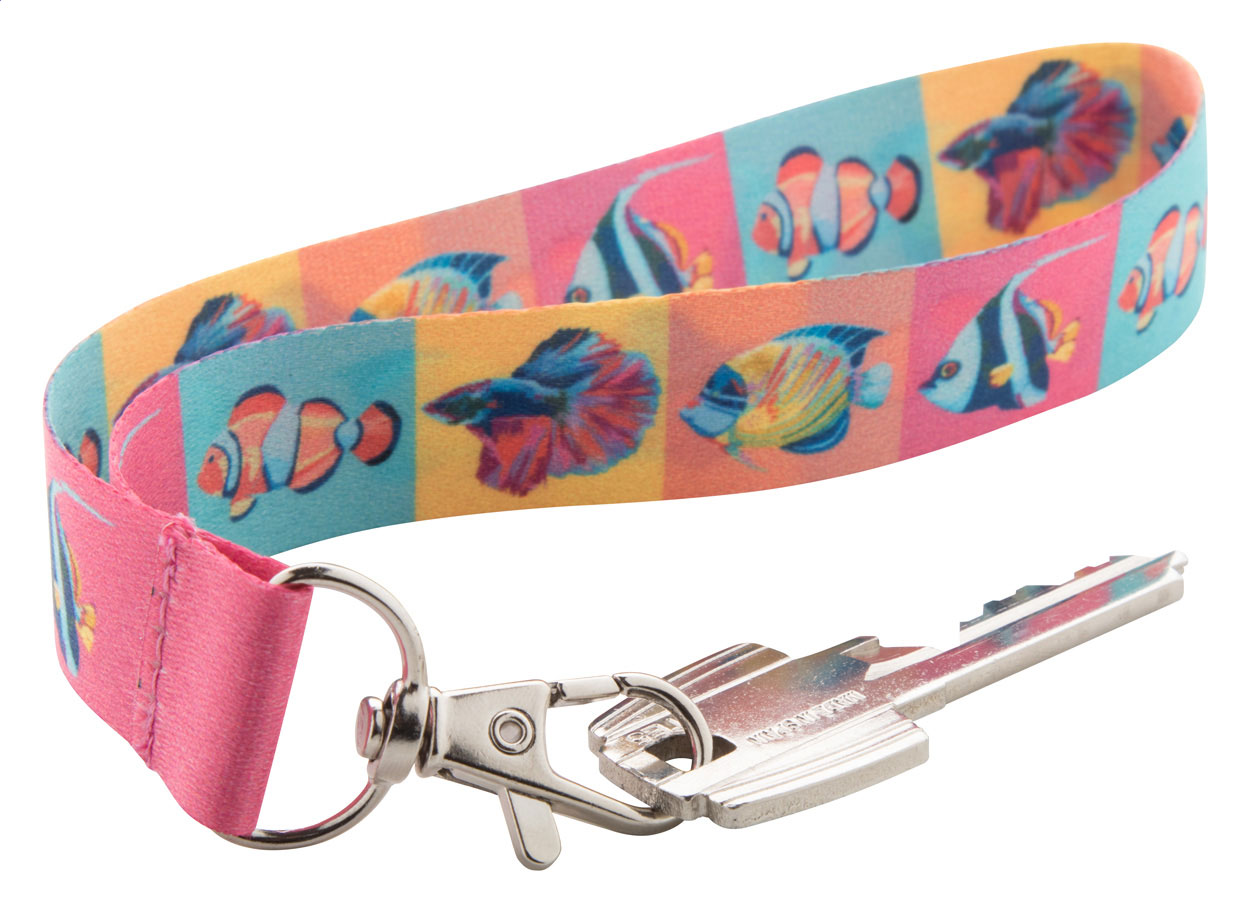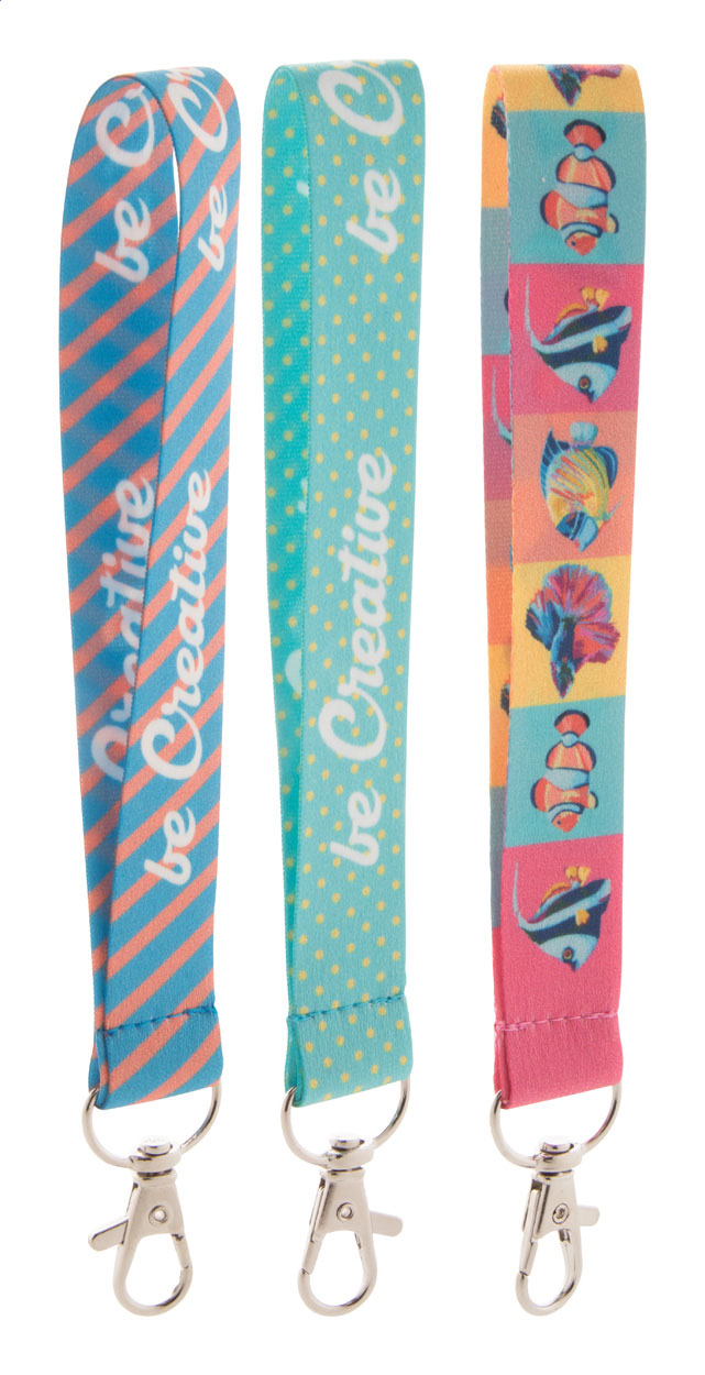 Schlüsselanhänger aus Polyester mit Metallkarabiner, inkl. Sublimationsdruck auf beiden Seiten. Mindestmenge: 100 Stk.