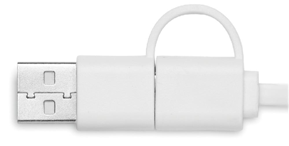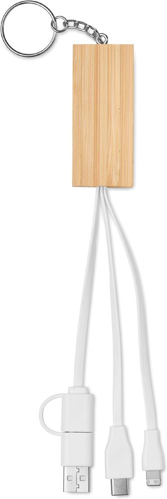 Schlüsselring mit Smartphone-Halter aus Bambus und Ladekabel. Eingang: 2-in-1 Typ-C & Typ-A. Ausgang: Typ-C und Mikro-B (2 in 1 Pin).