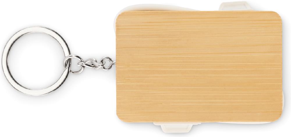 Schlüsselring mit Ladekabel. Bambus-Cover. Eingang: 2-in-1 Typ-C und Typ-A. Ausgang: Typ-C und Mikro-B (2 in 1 Pin).