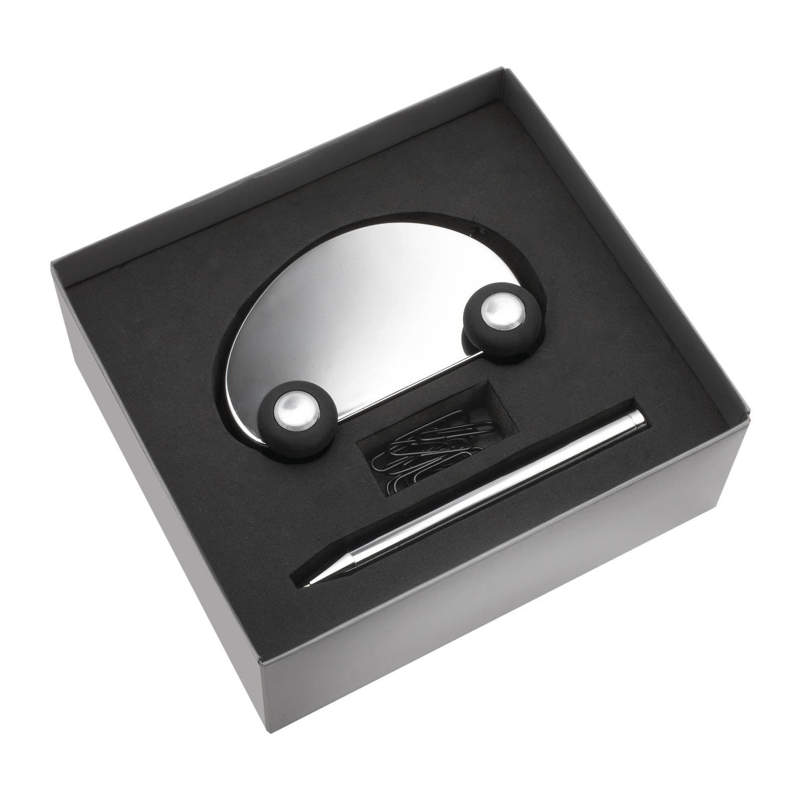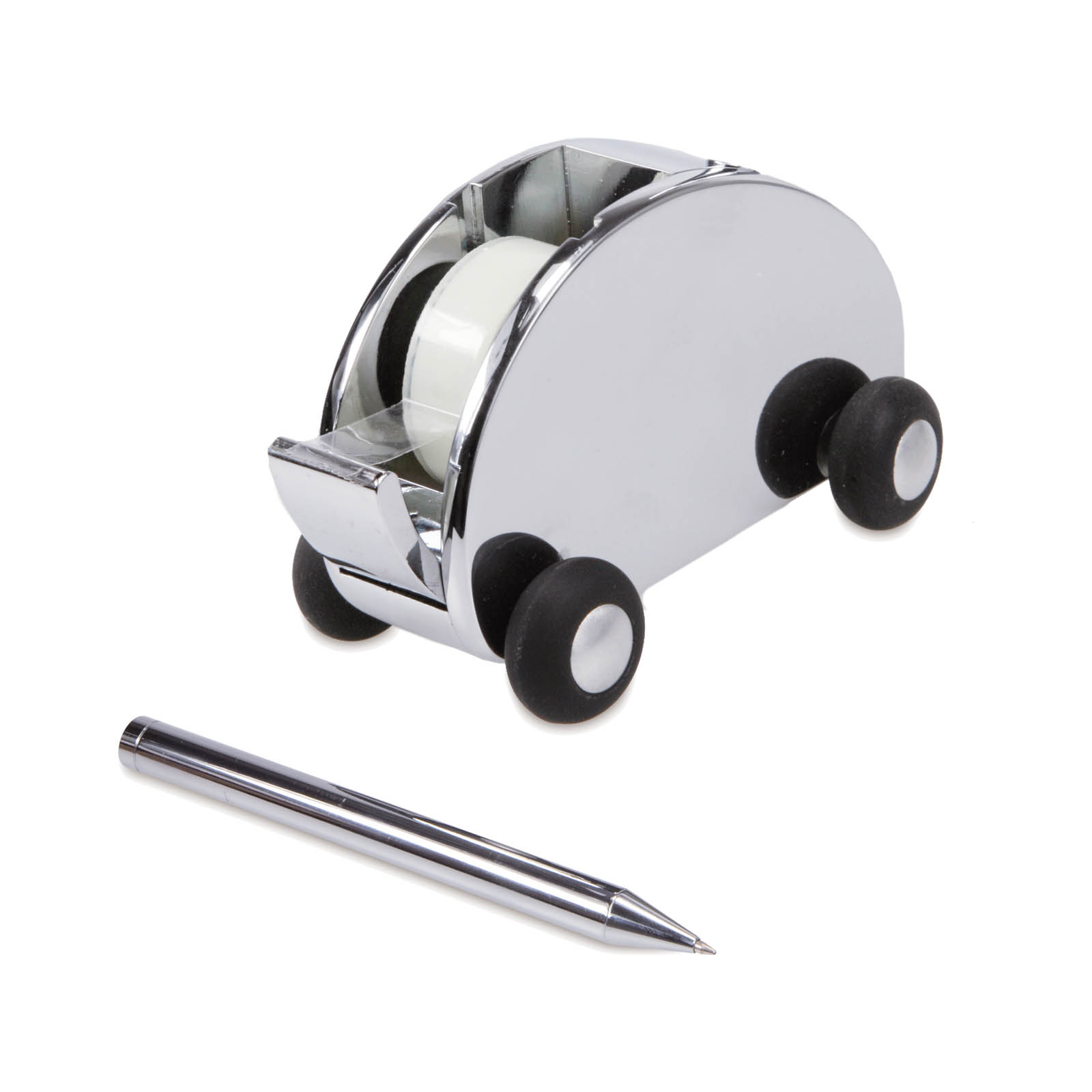 Hochwertiges magnetisches Design-Set mit Klebebandabroller, Kugelschreiber und Büroklammern.