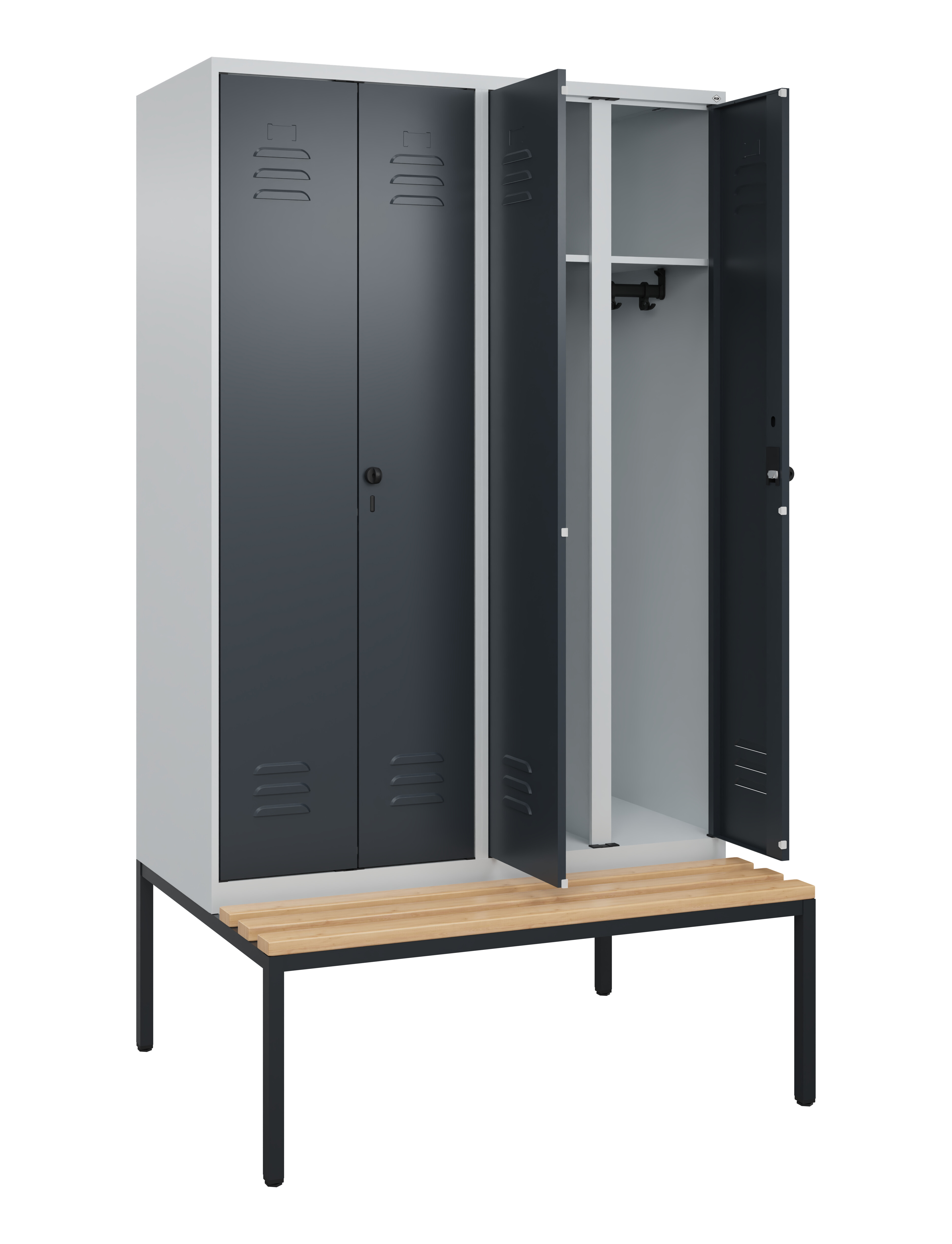 Schwarz-Weiß-Spind Classic PLUS, 4 Abteile für 2 Personen, zur getrennten Unterbringung von Privat- und Berufskleidung, Abteilbreite 300 mm, Korpus aus stabiler Stahlkonstruktion mit hochwertiger Einbrennbeschichtung für hohe UV- und Korrosionsbeständigkeit, mit hinteren Belüftungsöffnungen oben und unten, innen je Abteil 1 Ablageboden, darunter 1 stabile Garderobenstange aus Ovalprofil mit 3 verdrehsicheren Doppel-Schiebehaken inkl. Systemaufnahme, Türen paarweise zueinanderschlagend für gemeinsamen Verschluss, mit untergebauter Sitzbank, Gestell aus stabilem Vierkant-Stahlrohr 30 x 30 mm, mit verstellbaren Bodengleitern für einfachen Niveauausgleich, Türöffnungen 110 Grad, Stahl-Türen mit Soft-Anschlag und geschlossenen Seitenprofilen für hohe Stabilität, mit Lüftungskiemen oben und unten sowie eingestanztem Etikettenrahmen, Türaufhängung in stabilen Drehbolzen, 2 Ergonomische Sicherheits-Drehriegel für Vorhangschlösser mit Bügelstärke 6 bis 8 mm, inkl. Tür-Schutz, Sitzleisten aus Buche-Hartholz, im Profil ca. 60 x 30 mm, für guten Sitzkomfort, allseitig gehobelt, klarlackiert mit naturgegebenen Farbunterschieden, Maße (H x B x T): 2120 x 1200 x 815 mm, Korpus: RAL 7035 Lichtgrau, Türen Stahl: RAL 7016 Anthrazitgrau, Gestell: RAL 7021 Schwarzgrau, Gewicht: 71 kg