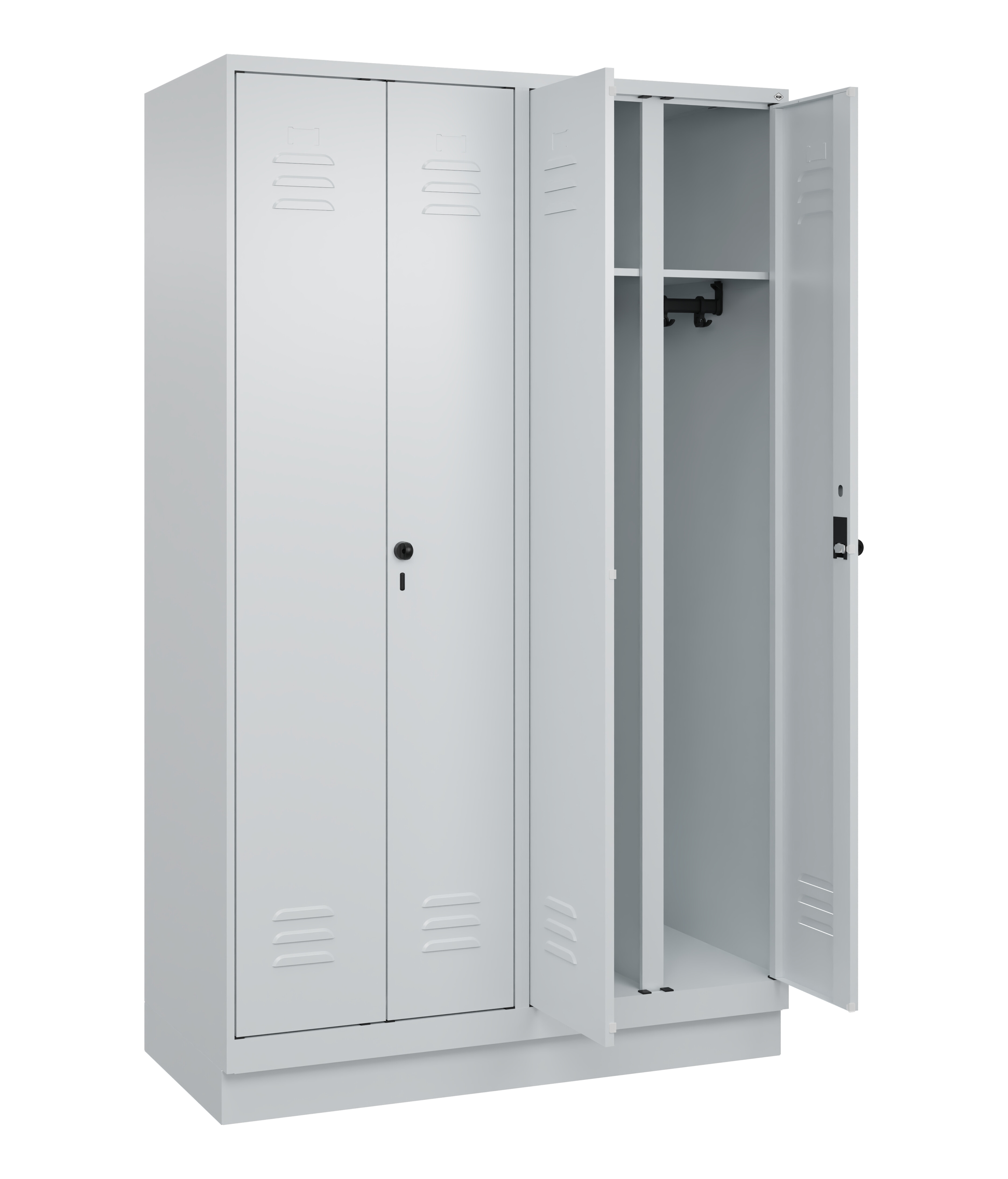 Schwarz-Weiß-Spind Classic PLUS, 4 Abteile für 2 Personen, zur getrennten Unterbringung von Privat- und Berufskleidung, Abteilbreite 300 mm, Korpus aus stabiler Stahlkonstruktion mit hochwertiger Einbrennbeschichtung für hohe UV- und Korrosionsbeständigkeit, mit hinteren Belüftungsöffnungen oben und unten, innen je Abteil 1 Ablageboden, darunter 1 stabile Garderobenstange aus Ovalprofil mit 3 verdrehsicheren Doppel-Schiebehaken inkl. Systemaufnahme, Türen paarweise zueinanderschlagend für gemeinsamen Verschluss, auf 100 mm hohem Sockel, Stahl-Türen mit Soft-Anschlag und geschlossenen Seitenprofilen für hohe Stabilität, mit Lüftungskiemen oben und unten sowie eingestanztem Etikettenrahmen, Türaufhängung in stabilen Drehbolzen, Türöffnungen 110 Grad, 2 Ergonomische Sicherheits-Drehriegel für Vorhangschlösser mit Bügelstärke 6 bis 8 mm, inkl. Tür-Schutz, Maße (H x B x T): 1950 x 1200 x 500 mm, Korpus: RAL 7035 Lichtgrau, Türen Stahl: RAL 7035 Lichtgrau, Sockel: RAL 7035 Lichtgrau, Gewicht: 66 kg