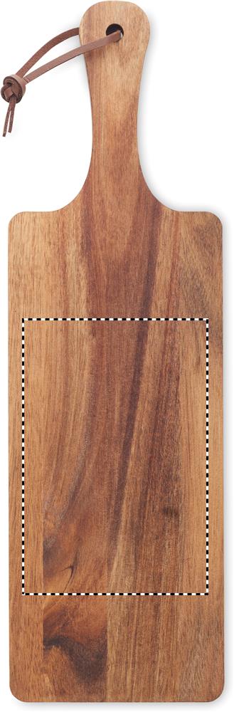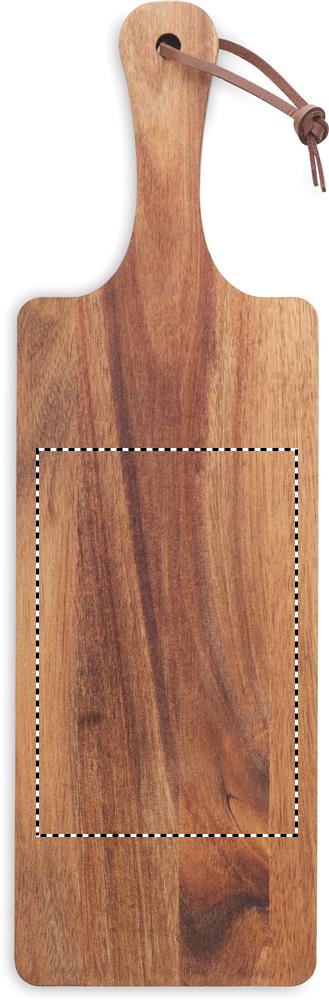 Servierbrett aus Akazienholz mit Griff. Aufhänger aus PU. Holz ist ein natürliches Produkt, es kann daher zu leichten Abweichungen in Farbe, Dekor und Maßen kommen.