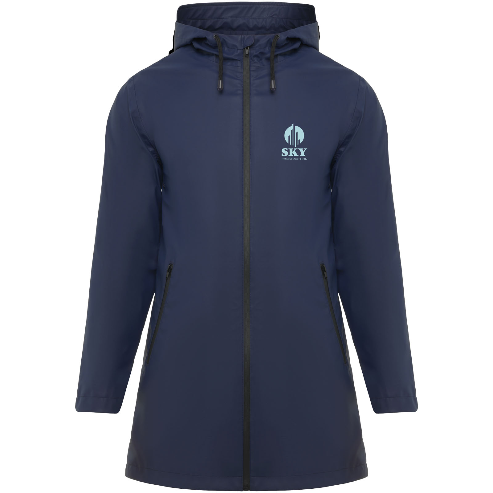 Polyester - TaffetaRegenjacke mit durchgehendem ReißverschlussIn Kragen gefaltete Kapuze mit KordelzügenZwei Taschen mit Reißverschluss und KlappeElastische ÄrmelabschlüsseSaum mit verstellbaren Kordelzügen und StoppernWindabweisendWasserabweisendHerausreißbares LabelMaterial: 100% PolyesterGrammatur: 70 g/m²Gewicht: 0.234Hergestellt nach: Oeko-Tex 100Veredelung: Bestickung, Bedruckung, Beflockung