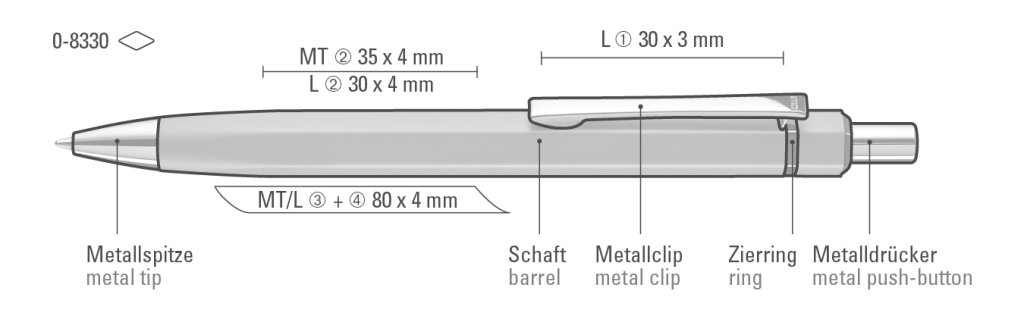 Druckbereich: In Clipverlängerung 35mm x 4mm Tampondruck (MT), seitlich vom Clip 70mm x 4mm Tampondruck (MT), gegenüber vom Clip 70mm x 4mm Tampondruck (MT), auf dem Clip 30mm x 3mm Lasergravur (L), in Clipverlängerung 35mm x 4mm Lasergravur (L), seitlich vom Clip 70mm x 4mm Lasergravur (L), gegenüber vom Clip 70mm x 4mm Lasergravur (L), auf dem Clip 30mm x 3mm Einzelnamensgravur (EL), in Clipverlängerung 35mm x 4mm Einzelnamensgravur (EL), seitlich vom Clip 70mm x 4mm Einzelnamensgravur (EL), gegenüber vom Clip 70mm x 4mm Einzelnamensgravur (EL)