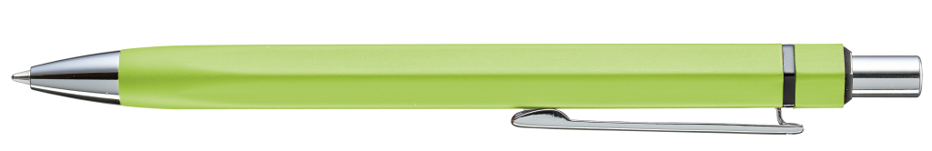 Metall-Druckkugelschreiber mit matt lackiertem, sechskantigem Aluminiumschaft. Metallclip, Metallspitze und Drücker silber glänzend. Zierring schwarz glänzend.