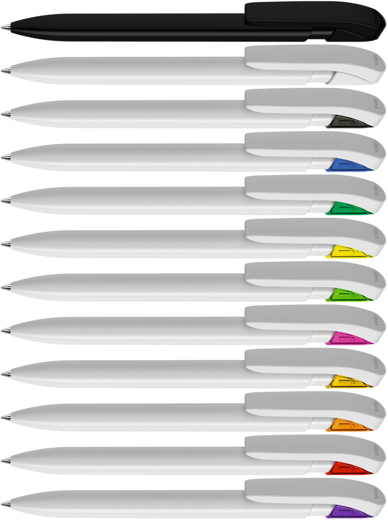 Druckkugelschreiber mit gedeckt glänzendem Gehäuse in uni weiß oder schwarz und farbig transparent glänzende Manschette.Druckbereich: Auf dem Clip 40mm x 7mm Tampondruck (T), in Clipverlängerung 50mm x 20mm Siebdruck (S), gegenüber vom Clip 70mm x 13mm Siebdruck (S), seitlich vom Clip 70mm x 13mm Siebdruck (S)