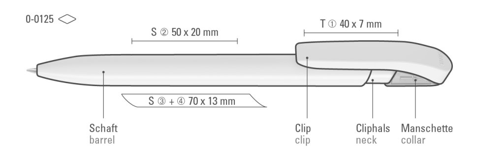 Druckbereich: Auf dem Clip 40mm x 7mm Tampondruck (T), in Clipverlängerung 50mm x 20mm Siebdruck (S), gegenüber vom Clip 70mm x 13mm Siebdruck (S), seitlich vom Clip 70mm x 13mm Siebdruck (S)