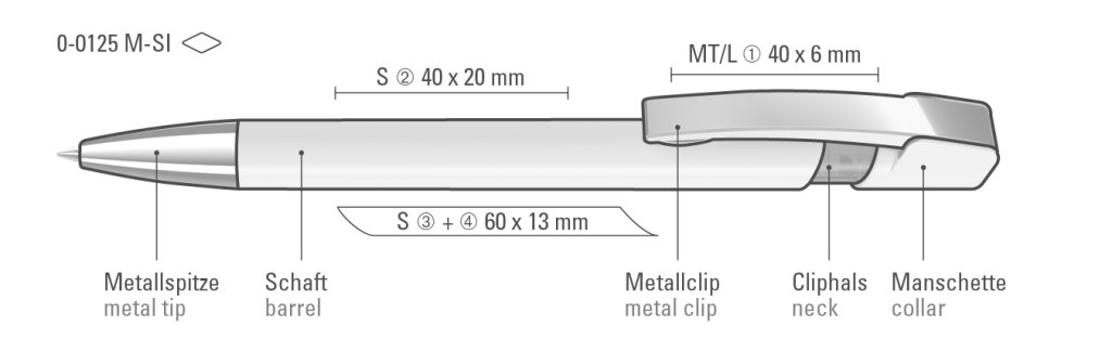 Druckbereich: Auf dem Clip 40mm x 6mm Lasergravur (L), auf dem Clip 40mm x 6mm Tampondruck (MT), in Clipverlängerung 40mm x 20mm Siebdruck (S), gegenüber vom Clip 60mm x 13mm Siebdruck (S), seitlich vom Clip 60mm x 13mm Siebdruck (S), auf dem Clip 40mm x 6mm Einzelnamensgravur (EL)