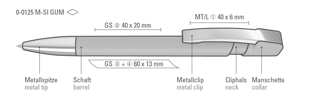 Druckbereich: Auf dem Clip 40mm x 6mm Lasergravur (L), auf dem Clip 40mm x 6mm Tampondruck (MT), in Clipverlängerung 40mm x 20mm Siebdruck (GS), gegenüber vom Clip 60mm x 13mm Siebdruck (GS), seitlich vom Clip 60mm x 13mm Siebdruck (GS), auf dem Clip 40mm x 6mm Einzelnamensgravur (EL)