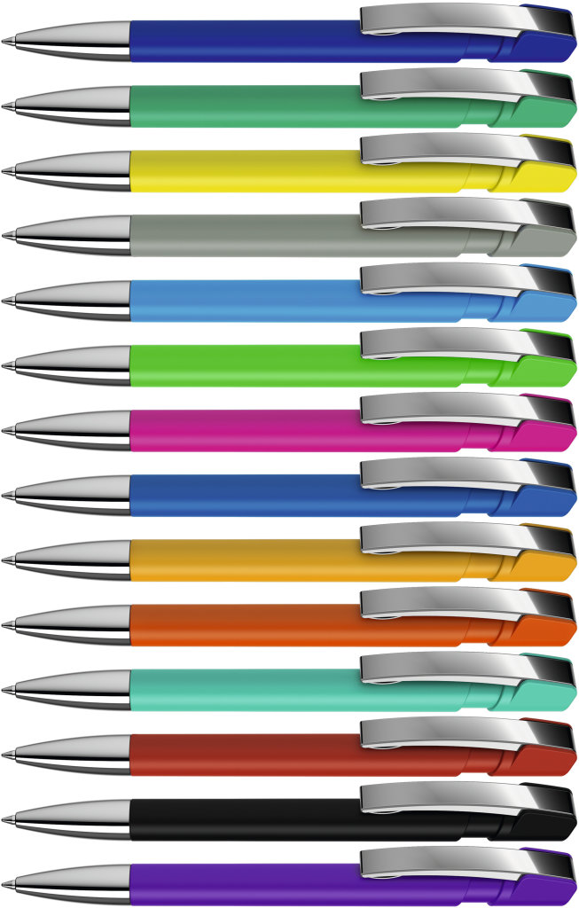 Druckkugelschreiber mit Softtouch-Gehäuse, flexiblem Metallclip und schwerer Metallspitze glanzverchromt.Druckbereich: Auf dem Clip 40mm x 6mm Lasergravur (L), auf dem Clip 40mm x 6mm Tampondruck (MT), in Clipverlängerung 40mm x 20mm Siebdruck (GS), gegenüber vom Clip 60mm x 13mm Siebdruck (GS), seitlich vom Clip 60mm x 13mm Siebdruck (GS), auf dem Clip 40mm x 6mm Einzelnamensgravur (EL)
