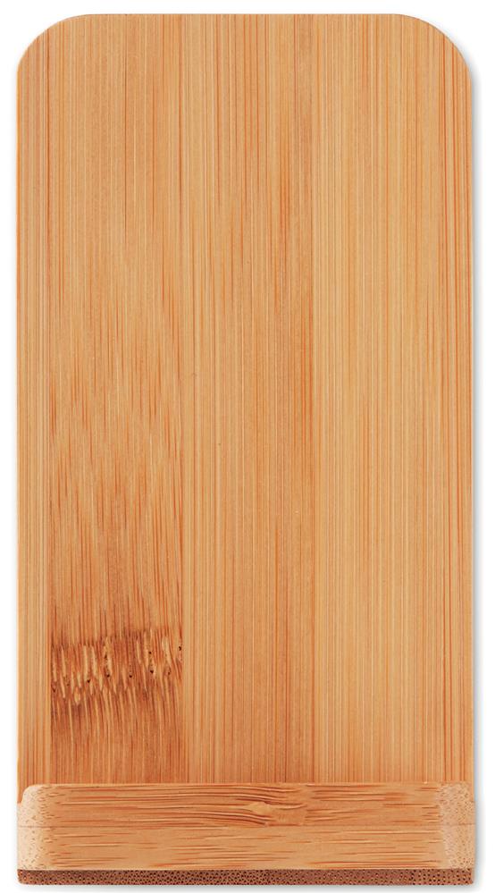 Smartphone-Halter mit induktiver Double Coil Ladestation. Bambus-Gehäuse. Laden Sie Ihr Smartphone durch einfaches Abstellen auf. Ausgangsstrom: DC5V/1A (15W). Kompatibel mit den neuesten Android Smartphones, iPhone® 8, 8S und X und höher.