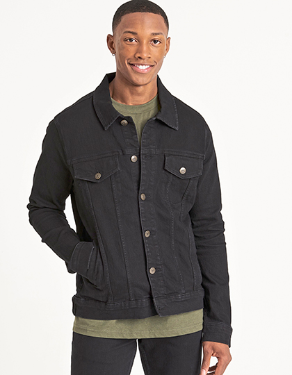 Standard-PassformStretch-DenimAufgesetzte Brusttaschen mit Patte und Knopf und zwei schräge Eingriff-Taschen an der HüfteKontrastnähteKlassisches Jeansjacken-DesignSpitzer Kragen, Knopfverschluss mit Ösen vorneKnopfleisten am hinteren SaumRückwärtiger AufhängerLange Ärmel mit geknöpfter ManschetteMaterial: 99% Baumwolle, 1% Elasthan (Black: 73% Baumwolle, 25% Polyester, 2% Elasthan)Grammatur: 298 g/m², Black: 312 g/m²Gewicht: 0.845Hergestellt nach: Vegan, Oeko-Tex 100Veredelung: Bestickung, Bedruckung, Beflockung