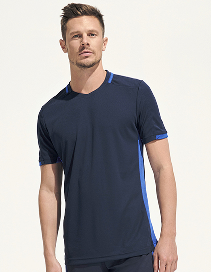V-Neck mit Kontrast-KragenKontrastfarbene Mesh-Einsätze an den SeitenAtmungsaktives PolyesterMaterial: 100% PolyesterGrammatur: 150 g/m²Gewicht: 0.157Hergestellt nach: Faire Arbeitsbedingungen, VeganVeredelung: Bestickung, Bedruckung, Beflockung