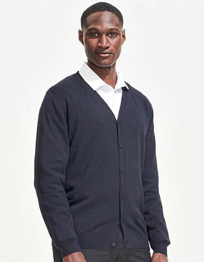 Feinstrick12 GaugeCardigan mit V-AusschnittKnöpfe mit Perlmutt-Effekt1x1 Ripp-KragenRundgestrickter Saum und BündchenSet-In-ÄrmelZwei FronttaschenMaterial: 50% Baumwolle, 50% PolyacrylGewicht: 0.229Hergestellt nach: Oeko-Tex 100, Faire ArbeitsbedingungenVeredelung: Bestickung, Bedruckung, Beflockung