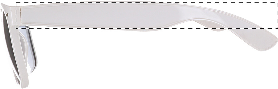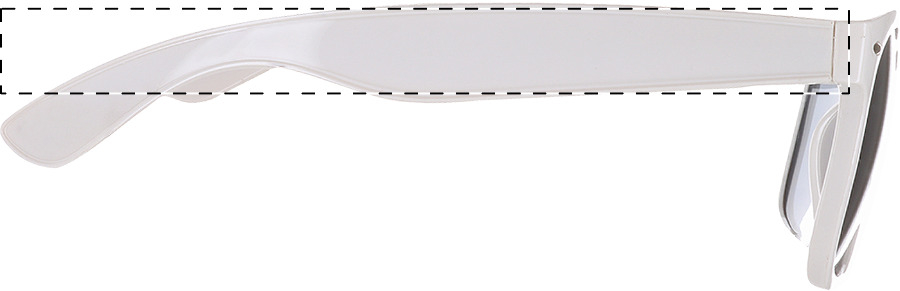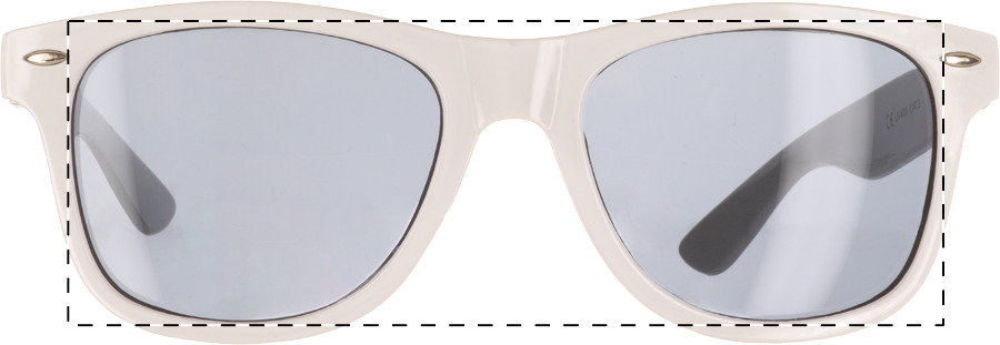 Sonnenbrille aus Kunststoff mit UV400 Schutz. Auf den Bügeln ist eine Vertiefung, ideal für ein Doming. Der Preis ist inkl. Doming auf beiden Bügeln. Mindestmenge: 100 Stk.