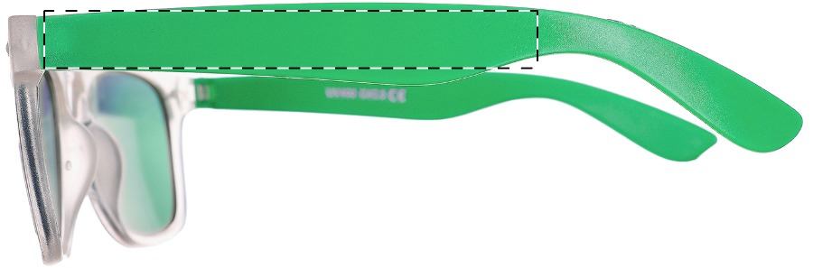 Sonnenbrille aus Kunststoff mit UV 400 Schutz. Die Farbe der Bügel und des Rahmens kann individuell kombiniert werden. Mindestmenge: 50 Stk.Compliance & Zertifizierungen: UV400✅Material: KunststoffVeredelungsposition 1: Rechter BügelTechnologie: TampondruckMaximale Farben: 4Durchmesser: 0Druckcode: P1Veredelungsposition 2: Linker BügelTechnologie: TampondruckMaximale Farben: 4Durchmesser: 0Druckcode: P1Veredelungsposition 3: GläserTechnologie: Vision-Film-DruckDurchmesser: 0Druckcode: VF