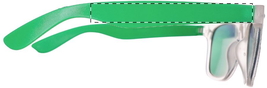 Sonnenbrille aus Kunststoff mit UV400 Schutz, transparenten Rahmen, farbigen Bügeln mit farblich angepasst-verspiegelten Gläsern.Compliance & Zertifizierungen: UV400✅Material: KunststoffVeredelungsposition 1: Rechter BügelTechnologie: TampondruckMaximale Farben: 4Durchmesser: 0Druckcode: P1Veredelungsposition 2: Linker BügelTechnologie: TampondruckMaximale Farben: 4Durchmesser: 0Druckcode: P1Veredelungsposition 3: GläserTechnologie: Vision-Film-DruckDurchmesser: 0Druckcode: VF