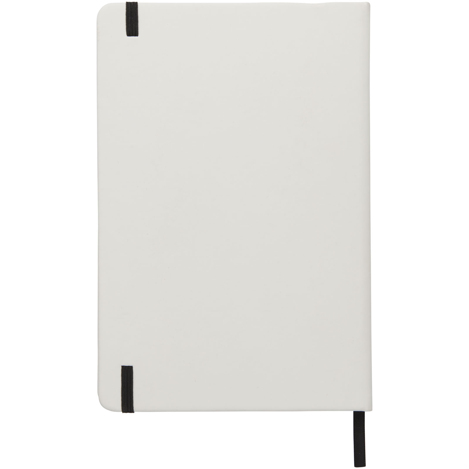 Weißes A5 Notizbuch mit farbigem Gummizug und Lesebändchen. Enthält 80 Blatt (60 g/m²) liniertes Papier.