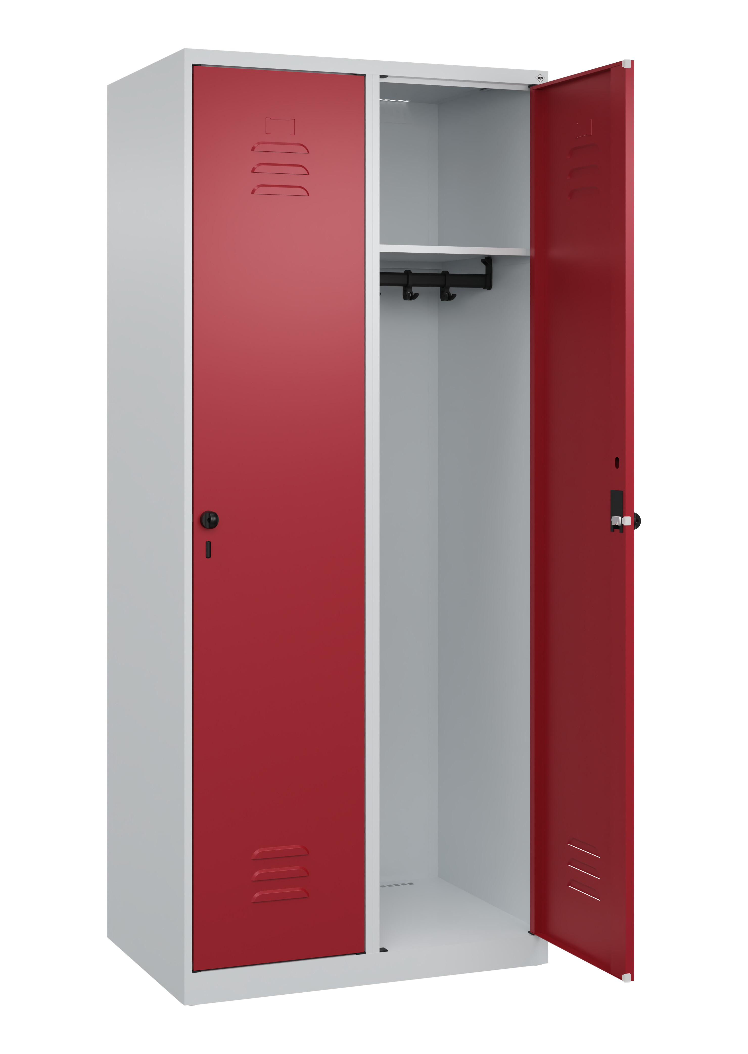 Spind Classic PLUS, 2 Abteile, Abteilbreite 300 mm, Korpus aus stabiler Stahlkonstruktion mit hochwertiger Einbrennbeschichtung für hohe UV- und Korrosionsbeständigkeit, mit hinteren Belüftungsöffnungen oben und unten, innen je Abteil 1 Ablageboden, darunter 1 stabile Garderobenstange aus Ovalprofil mit 3 verdrehsicheren Doppel-Schiebehaken inkl. Systemaufnahme, mit Bodengleitern als praktischer Schrank- und Fußbodenschutz, Türöffnungen 110 Grad, Türaufhängung rechts, Stahl-Türen mit Soft-Anschlag und geschlossenen Seitenprofilen für hohe Stabilität, mit Lüftungskiemen oben und unten sowie eingestanztem Etikettenrahmen, Türaufhängung in stabilen Drehbolzen, 2 Ergonomische Sicherheits-Drehriegel für Vorhangschlösser mit Bügelstärke 6 bis 8 mm, inkl. Tür-Schutz, Maße (H x B x T): 1850 x 600 x 500 mm, Korpus: RAL 7035 Lichtgrau, Türen Stahl: RAL 3020 Verkehrsrot, Gewicht: 35 kgProduktvorteile:Sicherheits-Drehriegelverschluss für Vorhängeschloss, ergonomisch geformt, dreht in geschlossenem Zustand durch und verhindert damit das Aufbrechen durch ÜberdrehenFronten zusätzlich mit Lüftungskiemen für noch effektivere BelüftungGeschlossene Tür-Seitenprofile für hohe VerwindungssteifigkeitKorpus mit Lüftungsöffnungen oben und unten für optimale Luftzirkulation