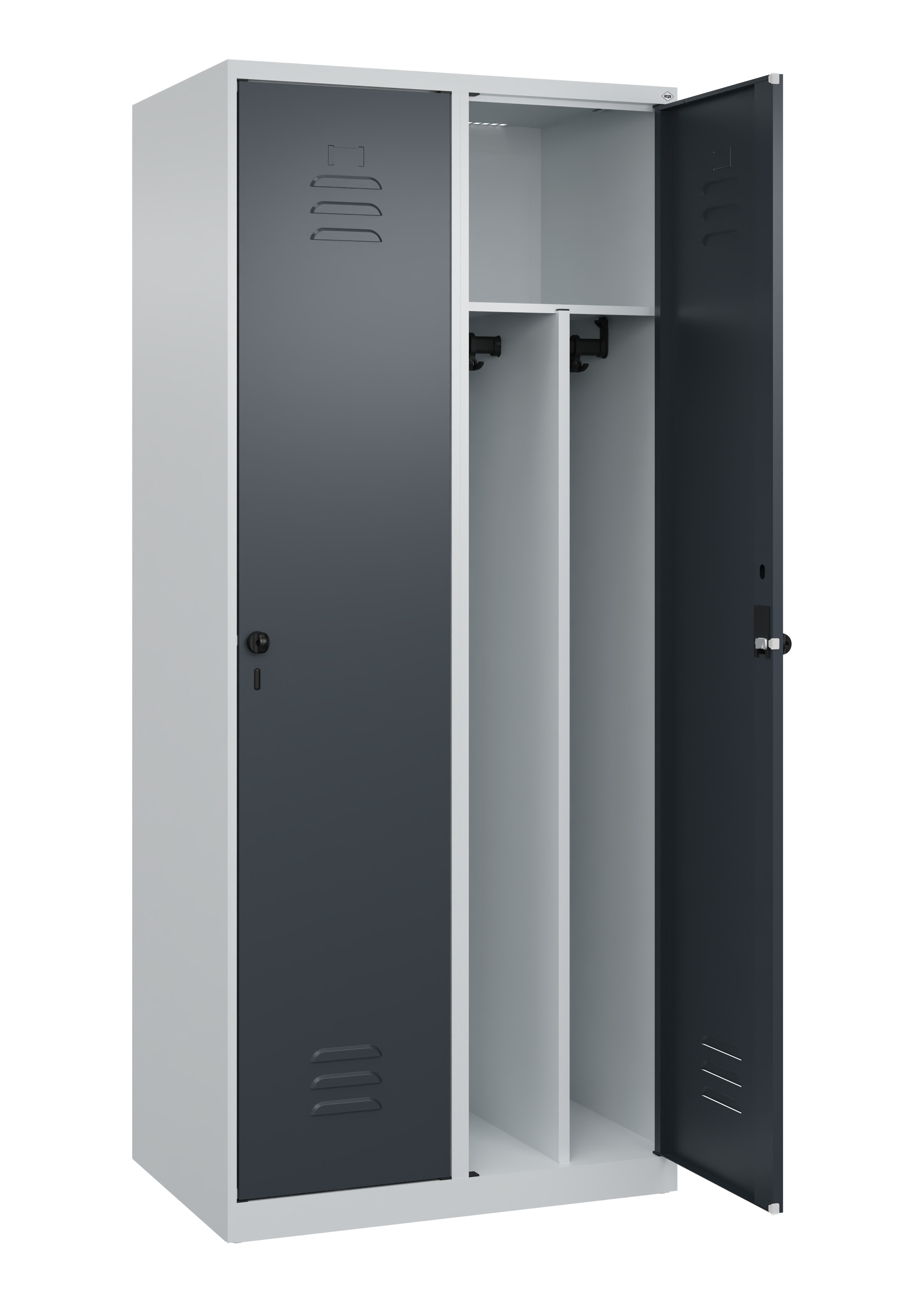 Spind Classic PLUS, 2 Abteile, Abteilbreite 400 mm, Korpus aus stabiler Stahlkonstruktion mit hochwertiger Einbrennbeschichtung für hohe UV- und Korrosionsbeständigkeit, mit hinteren Belüftungsöffnungen oben und unten, innen je Abteil 1 Ablageboden, darunter 1 Mitteltrennwand sowie links und rechts stabile Garderobenstange aus Ovalprofil mit je 2 verdrehsicheren Doppel-Schiebehaken inkl. Systemaufnahme, mit Bodengleitern als praktischer Schrank- und Fußbodenschutz, Türöffnungen 110 Grad, Türaufhängung rechts, Stahl-Türen mit Soft-Anschlag und geschlossenen Seitenprofilen für hohe Stabilität, mit Lüftungskiemen oben und unten sowie eingestanztem Etikettenrahmen, Türaufhängung in stabilen Drehbolzen, 2 Ergonomische Sicherheits-Drehriegel für Vorhangschlösser mit Bügelstärke 6 bis 8 mm, inkl. Tür-Schutz, Maße (H x B x T): 1850 x 800 x 500 mm, Korpus: RAL 7035 Lichtgrau, Türen Stahl: RAL 7016 Anthrazitgrau, Gewicht: 41 kg