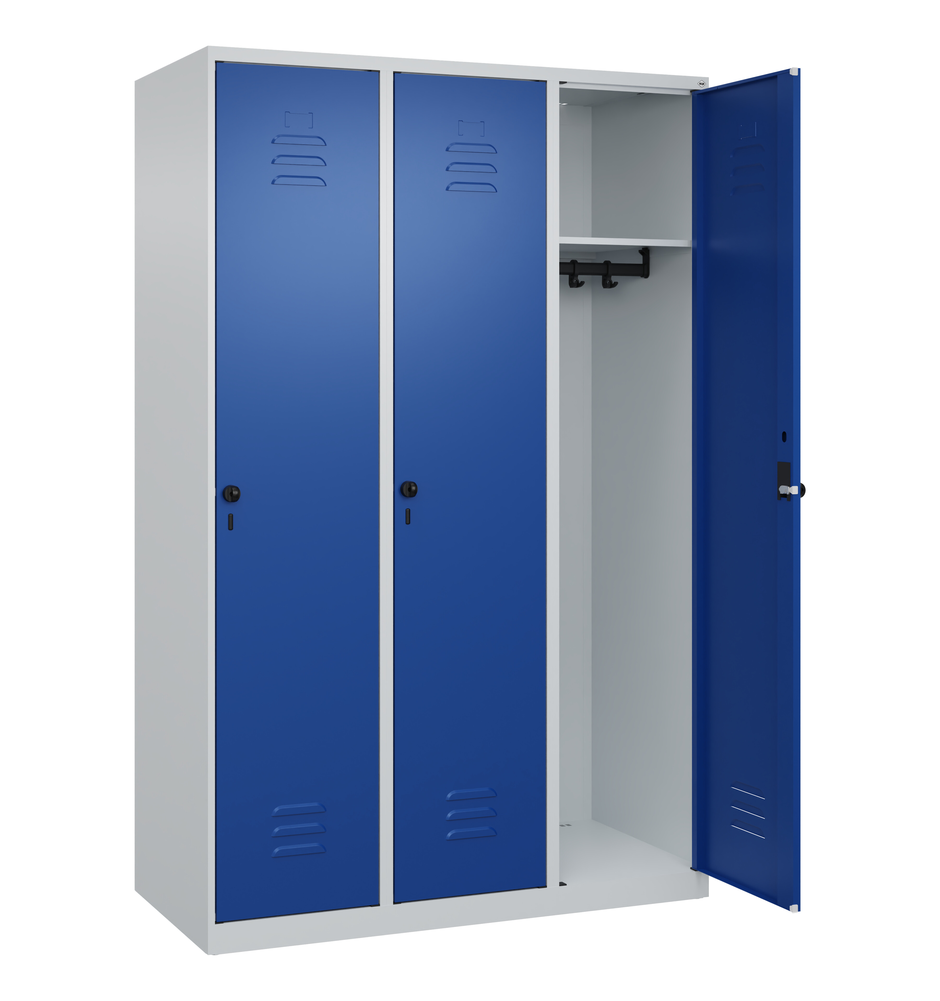 Spind Classic PLUS, 3 Abteile, Abteilbreite 400 mm, Korpus aus stabiler Stahlkonstruktion mit hochwertiger Einbrennbeschichtung für hohe UV- und Korrosionsbeständigkeit, mit hinteren Belüftungsöffnungen oben und unten, innen je Abteil 1 Ablageboden, darunter 1 stabile Garderobenstange aus Ovalprofil mit 3 verdrehsicheren Doppel-Schiebehaken inkl. Systemaufnahme, mit Bodengleitern als praktischer Schrank- und Fußbodenschutz, Türöffnungen 110 Grad, Türaufhängung rechts, Stahl-Türen mit Soft-Anschlag und geschlossenen Seitenprofilen für hohe Stabilität, mit Lüftungskiemen oben und unten sowie eingestanztem Etikettenrahmen, Türaufhängung in stabilen Drehbolzen, 3 Ergonomische Sicherheits-Drehriegel für Vorhangschlösser mit Bügelstärke 6 bis 8 mm, inkl. Tür-Schutz, Maße (H x B x T): 1850 x 1200 x 500 mm, Korpus: RAL 7035 Lichtgrau, Türen Stahl: RAL 5010 Enzianblau, Gewicht: 59 kg