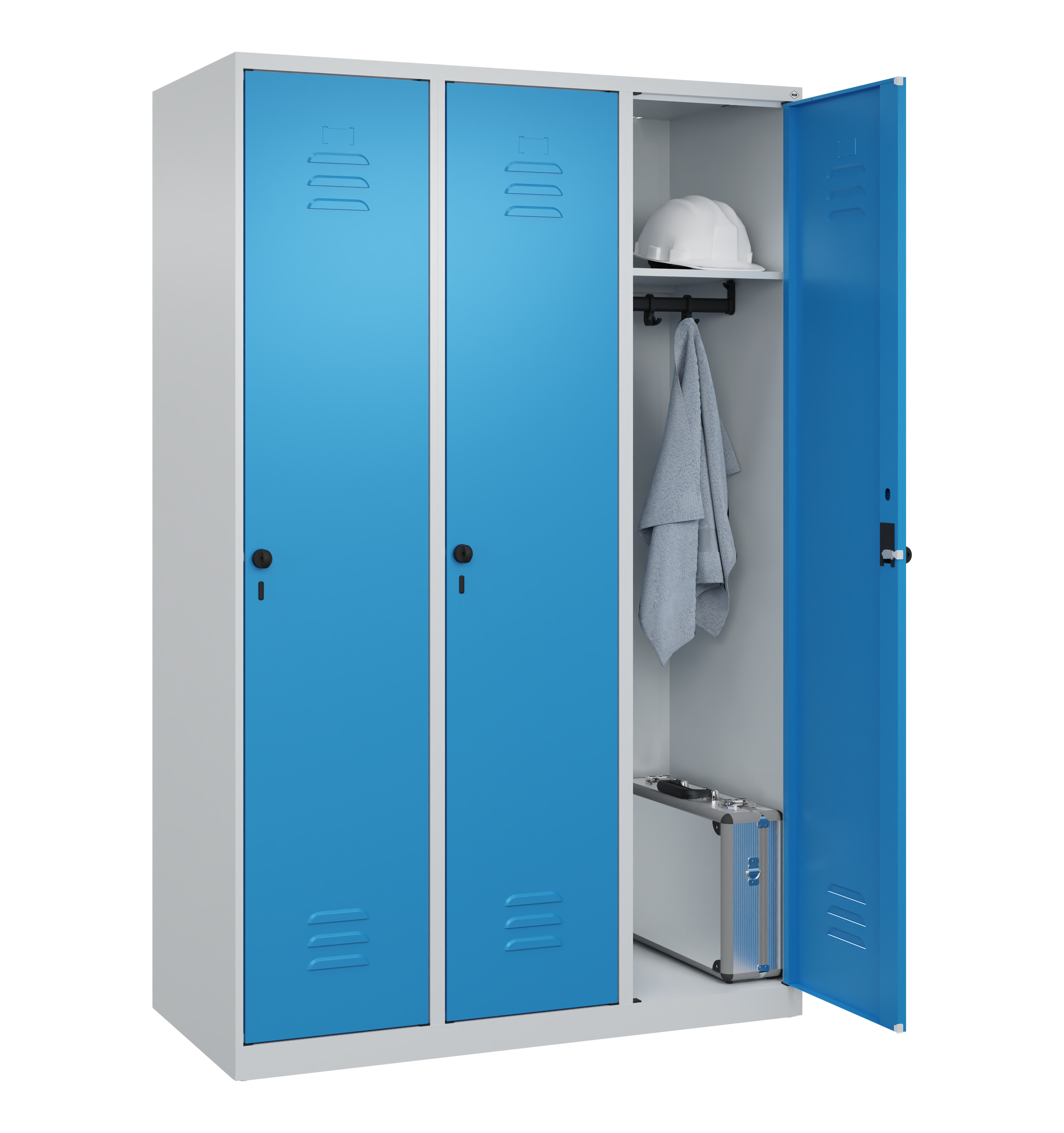 Spind Classic PLUS, 3 Abteile, Abteilbreite 400 mm, Korpus aus stabiler Stahlkonstruktion mit hochwertiger Einbrennbeschichtung für hohe UV- und Korrosionsbeständigkeit, mit hinteren Belüftungsöffnungen oben und unten, innen je Abteil 1 Ablageboden, darunter 1 stabile Garderobenstange aus Ovalprofil mit 3 verdrehsicheren Doppel-Schiebehaken inkl. Systemaufnahme, mit Bodengleitern als praktischer Schrank- und Fußbodenschutz, Türöffnungen 110 Grad, Türaufhängung rechts, Stahl-Türen mit Soft-Anschlag und geschlossenen Seitenprofilen für hohe Stabilität, mit Lüftungskiemen oben und unten sowie eingestanztem Etikettenrahmen, Türaufhängung in stabilen Drehbolzen, 3 Ergonomische Sicherheits-Drehriegel für Vorhangschlösser mit Bügelstärke 6 bis 8 mm, inkl. Tür-Schutz, Maße (H x B x T): 1850 x 1200 x 500 mm, Korpus: RAL 7035 Lichtgrau, Türen Stahl: RAL 5010 Enzianblau, Gewicht: 59 kgProduktvorteile:Sicherheits-Drehriegelverschluss für Vorhängeschloss, ergonomisch geformt, dreht in geschlossenem Zustand durch und verhindert damit das Aufbrechen durch ÜberdrehenFronten zusätzlich mit Lüftungskiemen für noch effektivere BelüftungGeschlossene Tür-Seitenprofile für hohe VerwindungssteifigkeitKorpus mit Lüftungsöffnungen oben und unten für optimale Luftzirkulation