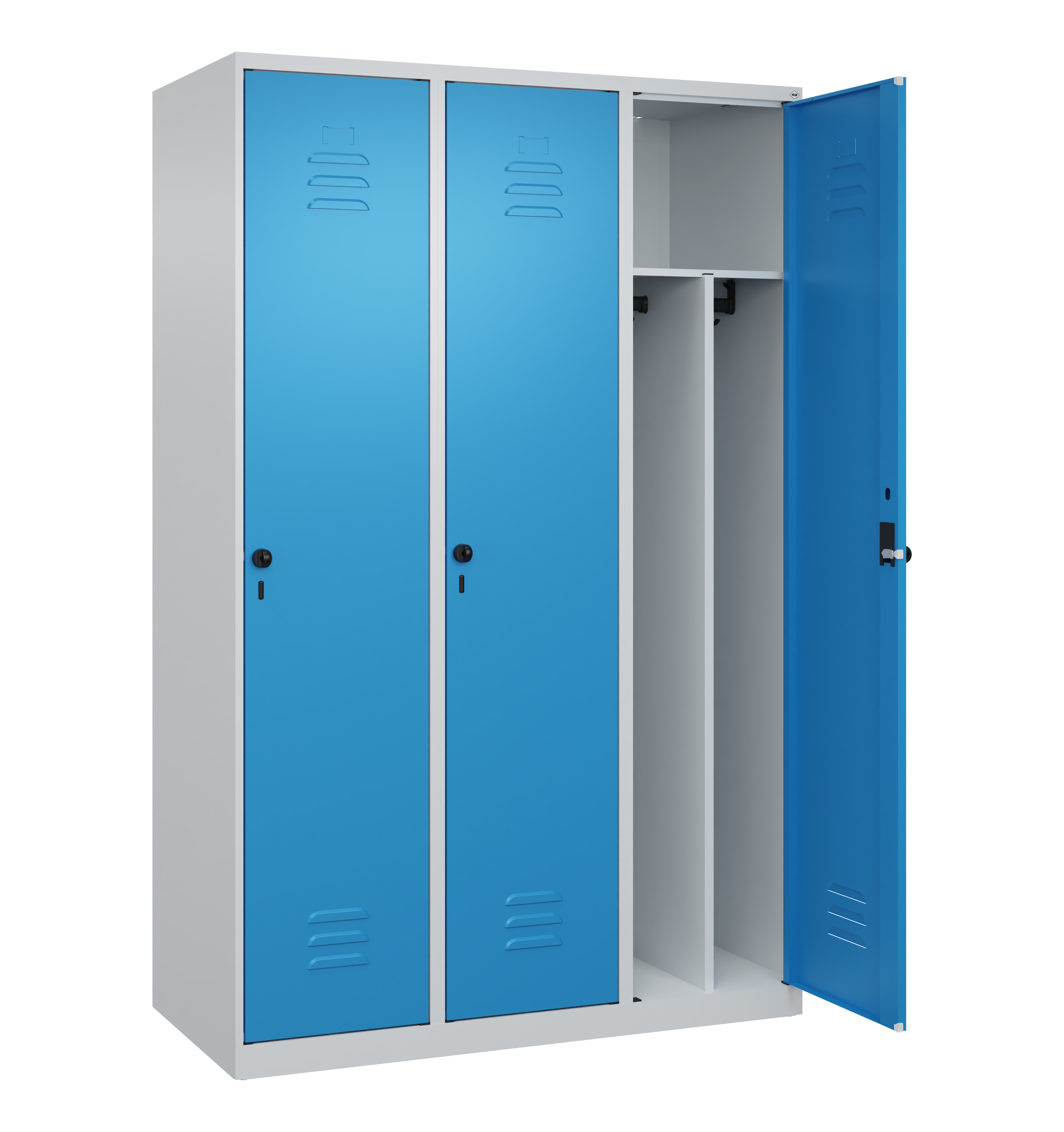 Spind Classic Plus, 3 Abteile, 1850x1200x500mm RAL 5012 Lichtblau RAL 7035 Lichtgrau