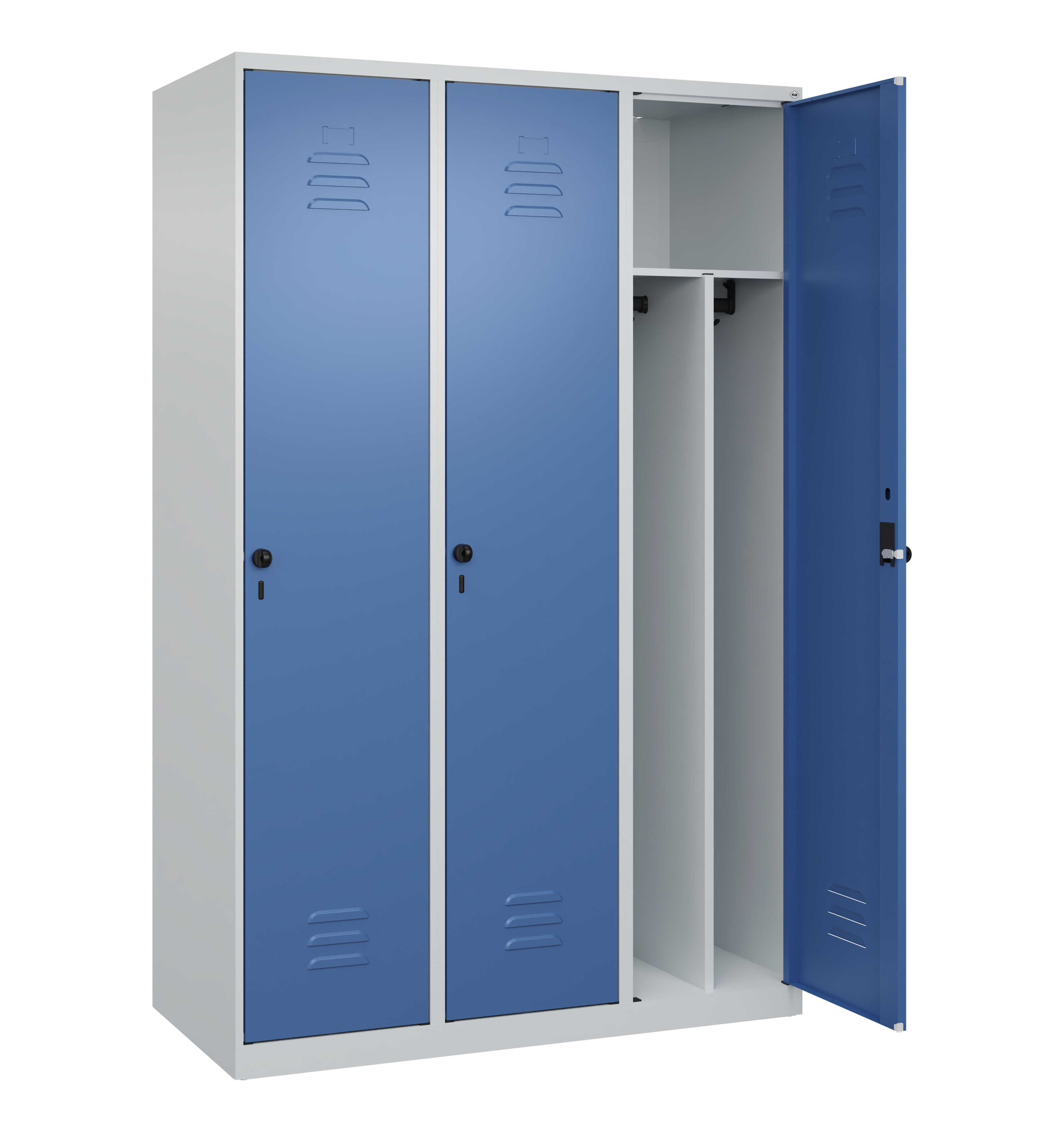 Spind Classic PLUS, 3 Abteile, Abteilbreite 400 mm, Korpus aus stabiler Stahlkonstruktion mit hochwertiger Einbrennbeschichtung für hohe UV- und Korrosionsbeständigkeit, mit hinteren Belüftungsöffnungen oben und unten, innen je Abteil 1 Ablageboden, darunter 1 Mitteltrennwand sowie links und rechts stabile Garderobenstange aus Ovalprofil mit je 2 verdrehsicheren Doppel-Schiebehaken inkl. Systemaufnahme, mit Bodengleitern als praktischer Schrank- und Fußbodenschutz, Türöffnungen 110 Grad, Türaufhängung rechts, Stahl-Türen mit Soft-Anschlag und geschlossenen Seitenprofilen für hohe Stabilität, mit Lüftungskiemen oben und unten sowie eingestanztem Etikettenrahmen, Türaufhängung in stabilen Drehbolzen, 3 Ergonomische Sicherheits-Drehriegel für Vorhangschlösser mit Bügelstärke 6 bis 8 mm, inkl. Tür-Schutz, Maße (H x B x T): 1850 x 1200 x 500 mm, Korpus: RAL 7035 Lichtgrau, Türen Stahl: RAL 5023 Fernblau, Gewicht: 59 kg