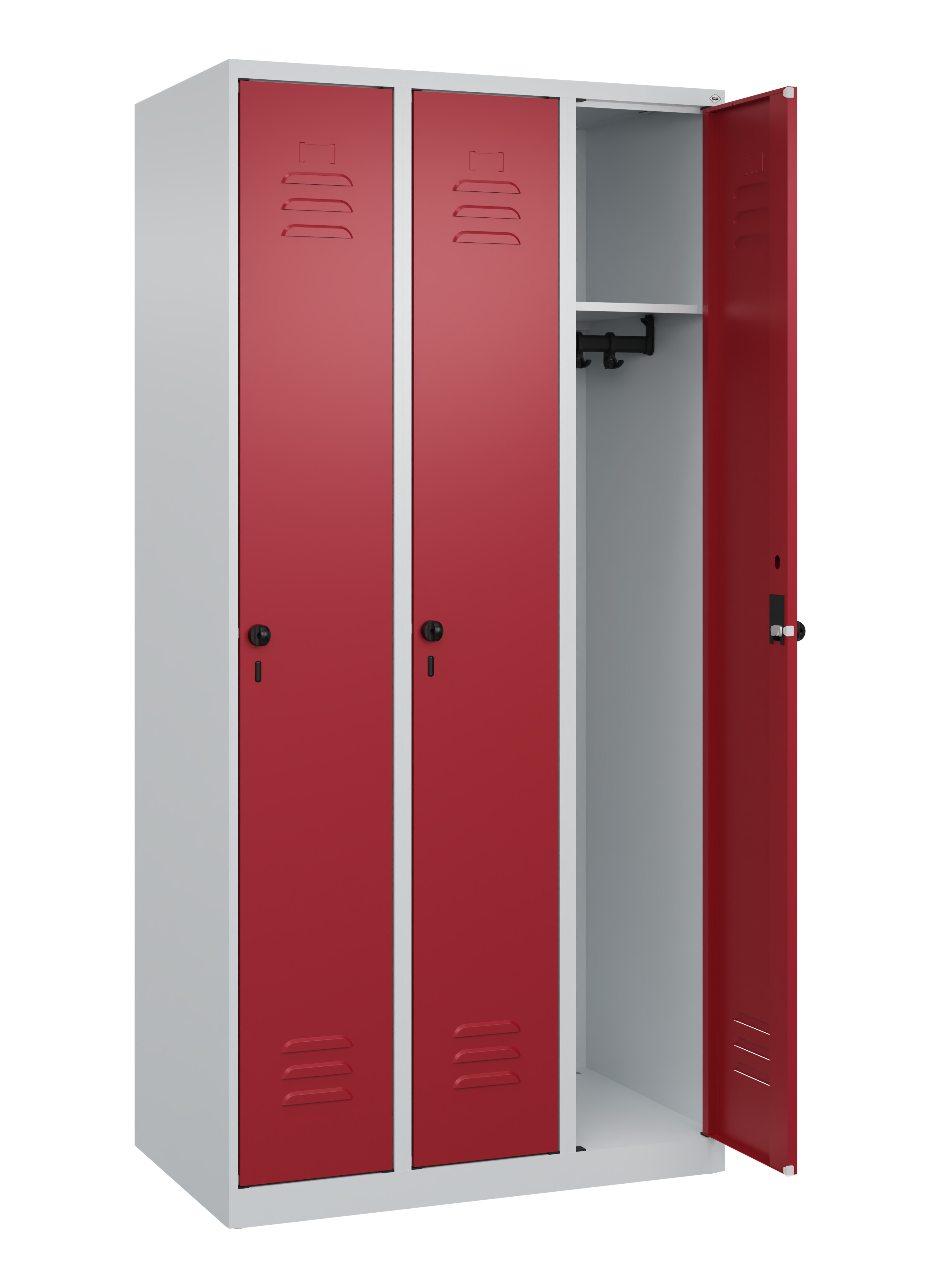 Spind Classic PLUS, 3 Abteile, Abteilbreite 300 mm, Korpus aus stabiler Stahlkonstruktion mit hochwertiger Einbrennbeschichtung für hohe UV- und Korrosionsbeständigkeit, mit hinteren Belüftungsöffnungen oben und unten, innen je Abteil 1 Ablageboden, darunter 1 stabile Garderobenstange aus Ovalprofil mit 3 verdrehsicheren Doppel-Schiebehaken inkl. Systemaufnahme, mit Bodengleitern als praktischer Schrank- und Fußbodenschutz, Türöffnungen 110 Grad, Türaufhängung rechts, Stahl-Türen mit Soft-Anschlag und geschlossenen Seitenprofilen für hohe Stabilität, mit Lüftungskiemen oben und unten sowie eingestanztem Etikettenrahmen, Türaufhängung in stabilen Drehbolzen, 3 Ergonomische Sicherheits-Drehriegel für Vorhangschlösser mit Bügelstärke 6 bis 8 mm, inkl. Tür-Schutz, Maße (H x B x T): 1850 x 900 x 500 mm, Korpus: RAL 7035 Lichtgrau, Türen Stahl: RAL 3003 Rubinrot, Gewicht: 49 kg
