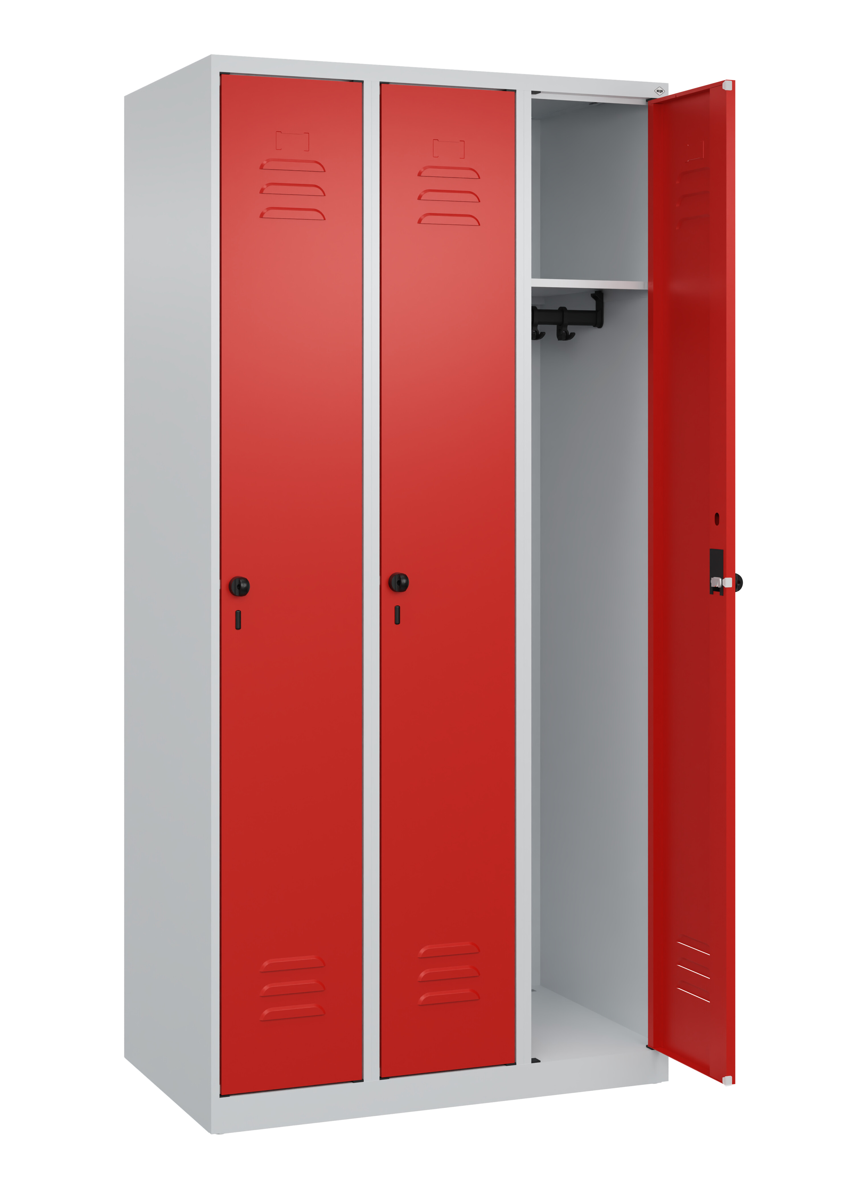 Spind Classic PLUS, 3 Abteile, Abteilbreite 300 mm, Korpus aus stabiler Stahlkonstruktion mit hochwertiger Einbrennbeschichtung für hohe UV- und Korrosionsbeständigkeit, mit hinteren Belüftungsöffnungen oben und unten, innen je Abteil 1 Ablageboden, darunter 1 stabile Garderobenstange aus Ovalprofil mit 3 verdrehsicheren Doppel-Schiebehaken inkl. Systemaufnahme, mit Bodengleitern als praktischer Schrank- und Fußbodenschutz, Türöffnungen 110 Grad, Türaufhängung rechts, Stahl-Türen mit Soft-Anschlag und geschlossenen Seitenprofilen für hohe Stabilität, mit Lüftungskiemen oben und unten sowie eingestanztem Etikettenrahmen, Türaufhängung in stabilen Drehbolzen, 3 Ergonomische Sicherheits-Drehriegel für Vorhangschlösser mit Bügelstärke 6 bis 8 mm, inkl. Tür-Schutz, Maße (H x B x T): 1850 x 900 x 500 mm, Korpus: RAL 7035 Lichtgrau, Türen Stahl: RAL 3020 Verkehrsrot, Gewicht: 49 kg