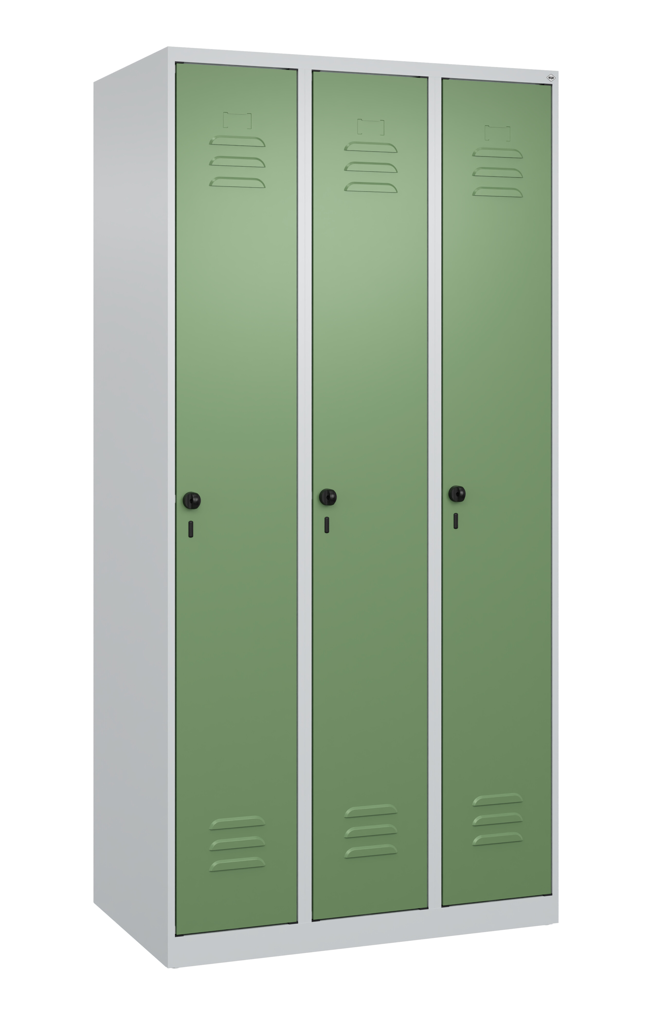 Spind Classic Plus, 3 Abteile, 1850x900x500mm RAL 6011 Resedagrün RAL 7035 Lichtgrau