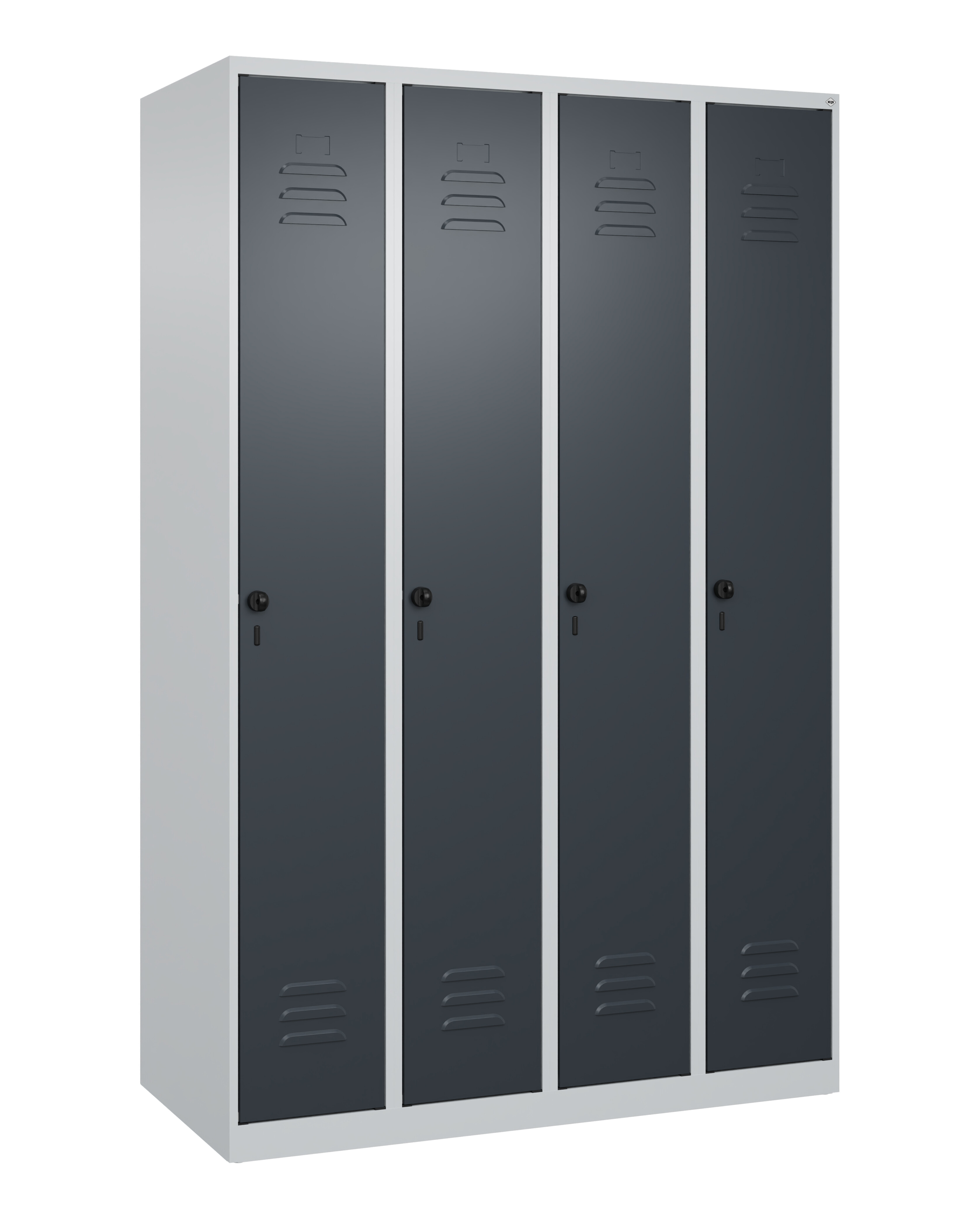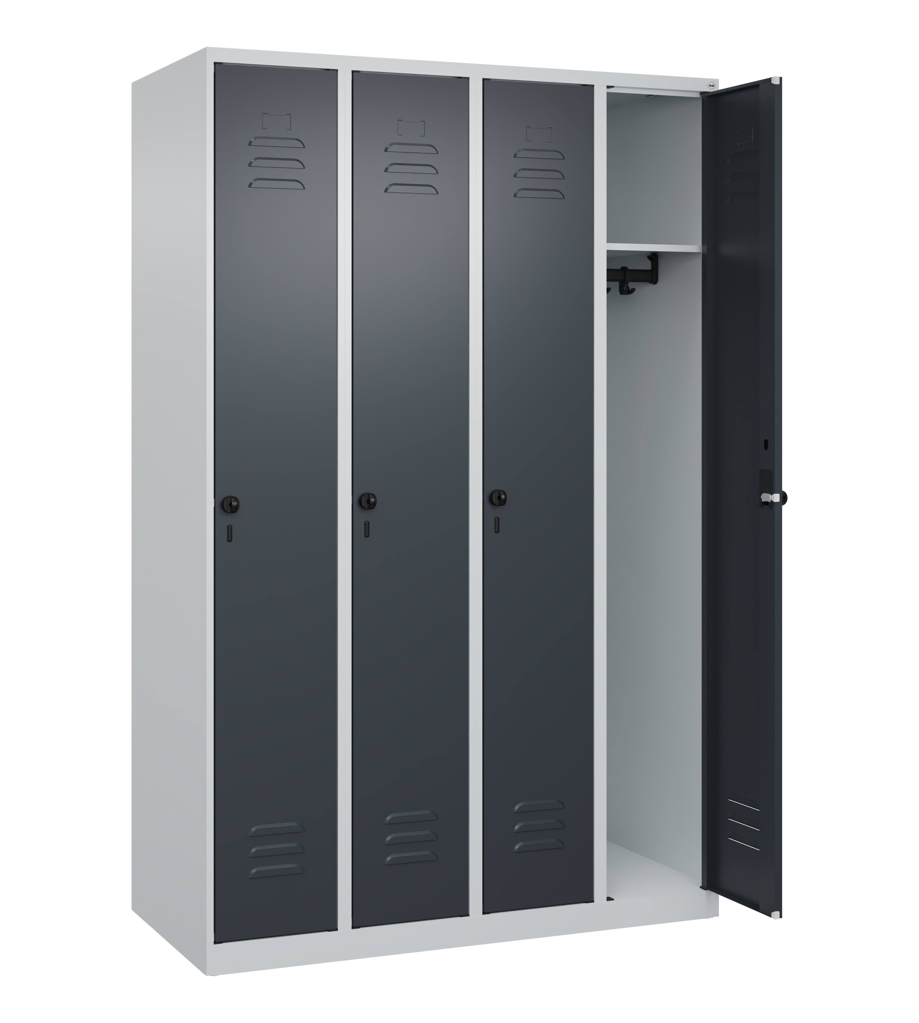 Spind Classic PLUS, 4 Abteile, Abteilbreite 300 mm, Korpus aus stabiler Stahlkonstruktion mit hochwertiger Einbrennbeschichtung für hohe UV- und Korrosionsbeständigkeit, mit hinteren Belüftungsöffnungen oben und unten, innen je Abteil 1 Ablageboden, darunter 1 stabile Garderobenstange aus Ovalprofil mit 3 verdrehsicheren Doppel-Schiebehaken inkl. Systemaufnahme, mit Bodengleitern als praktischer Schrank- und Fußbodenschutz, Türöffnungen 110 Grad, Türaufhängung rechts, Stahl-Türen mit Soft-Anschlag und geschlossenen Seitenprofilen für hohe Stabilität, mit Lüftungskiemen oben und unten sowie eingestanztem Etikettenrahmen, Türaufhängung in stabilen Drehbolzen, 4 Ergonomische Sicherheits-Drehriegel für Vorhangschlösser mit Bügelstärke 6 bis 8 mm, inkl. Tür-Schutz, Maße (H x B x T): 1850 x 1200 x 500 mm, Korpus: RAL 7035 Lichtgrau, Türen Stahl: RAL 7016 Anthrazitgrau, Gewicht: 63 kg