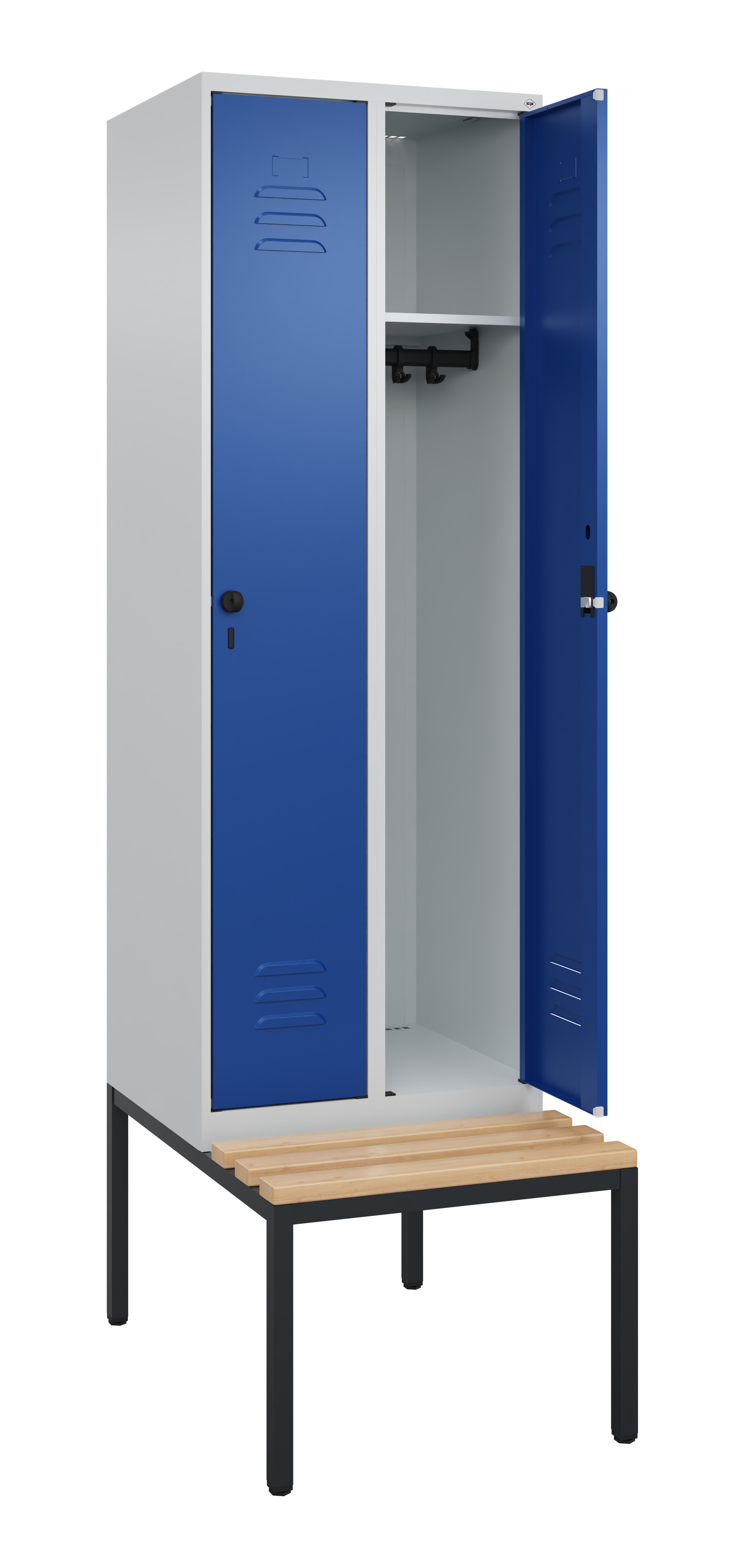 Spind Classic PLUS, 2 Abteile, Abteilbreite 300 mm, Korpus aus stabiler Stahlkonstruktion mit hochwertiger Einbrennbeschichtung für hohe UV- und Korrosionsbeständigkeit, mit hinteren Belüftungsöffnungen oben und unten, innen je Abteil 1 Ablageboden, darunter 1 stabile Garderobenstange aus Ovalprofil mit 3 verdrehsicheren Doppel-Schiebehaken inkl. Systemaufnahme, mit untergebauter Sitzbank, Gestell aus stabilem Vierkant-Stahlrohr 30 x 30 mm, mit verstellbaren Bodengleitern für einfachen Niveauausgleich, Türöffnungen 110 Grad, Türaufhängung rechts, Stahl-Türen mit Soft-Anschlag und geschlossenen Seitenprofilen für hohe Stabilität, mit Lüftungskiemen oben und unten sowie eingestanztem Etikettenrahmen, Türaufhängung in stabilen Drehbolzen, 2 Ergonomische Sicherheits-Drehriegel für Vorhangschlösser mit Bügelstärke 6 bis 8 mm, inkl. Tür-Schutz, Sitzleisten aus Buche-Hartholz, im Profil ca. 60 x 30 mm, für guten Sitzkomfort, allseitig gehobelt, klarlackiert mit naturgegebenen Farbunterschieden, Maße (H x B x T): 2120 x 600 x 815 mm, Korpus: RAL 7035 Lichtgrau, Türen Stahl: RAL 5010 Enzianblau, Gestell: RAL 7021 Schwarzgrau, Gewicht: 40 kg