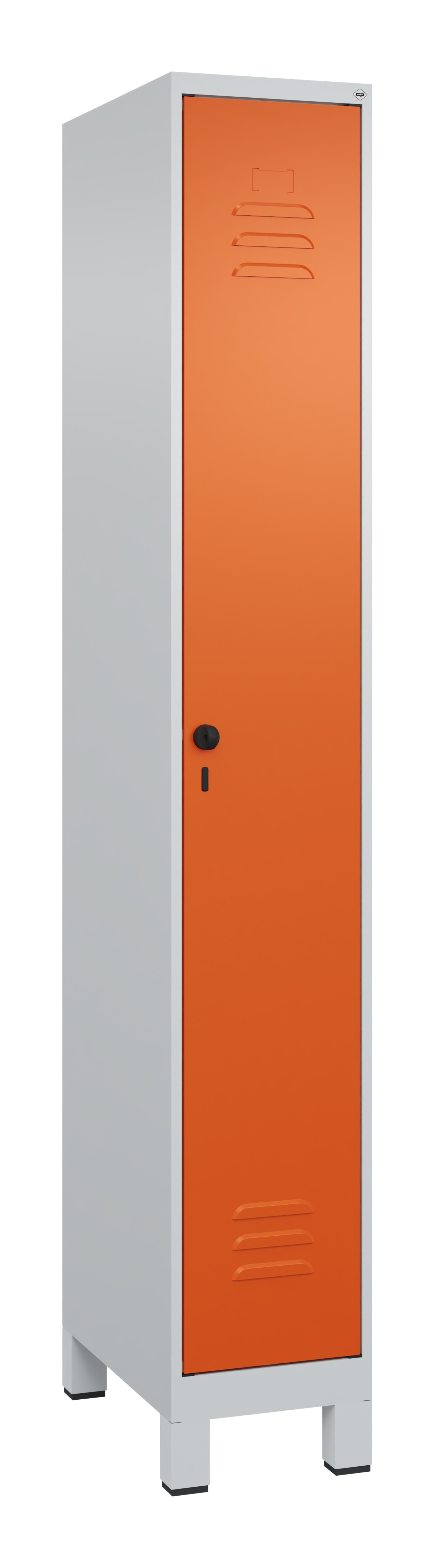 Spind Classic Plus, Füße, 1 Abteil, 1950x300x500mm RAL 2004 Reinorange RAL 7035 Lichtgrau