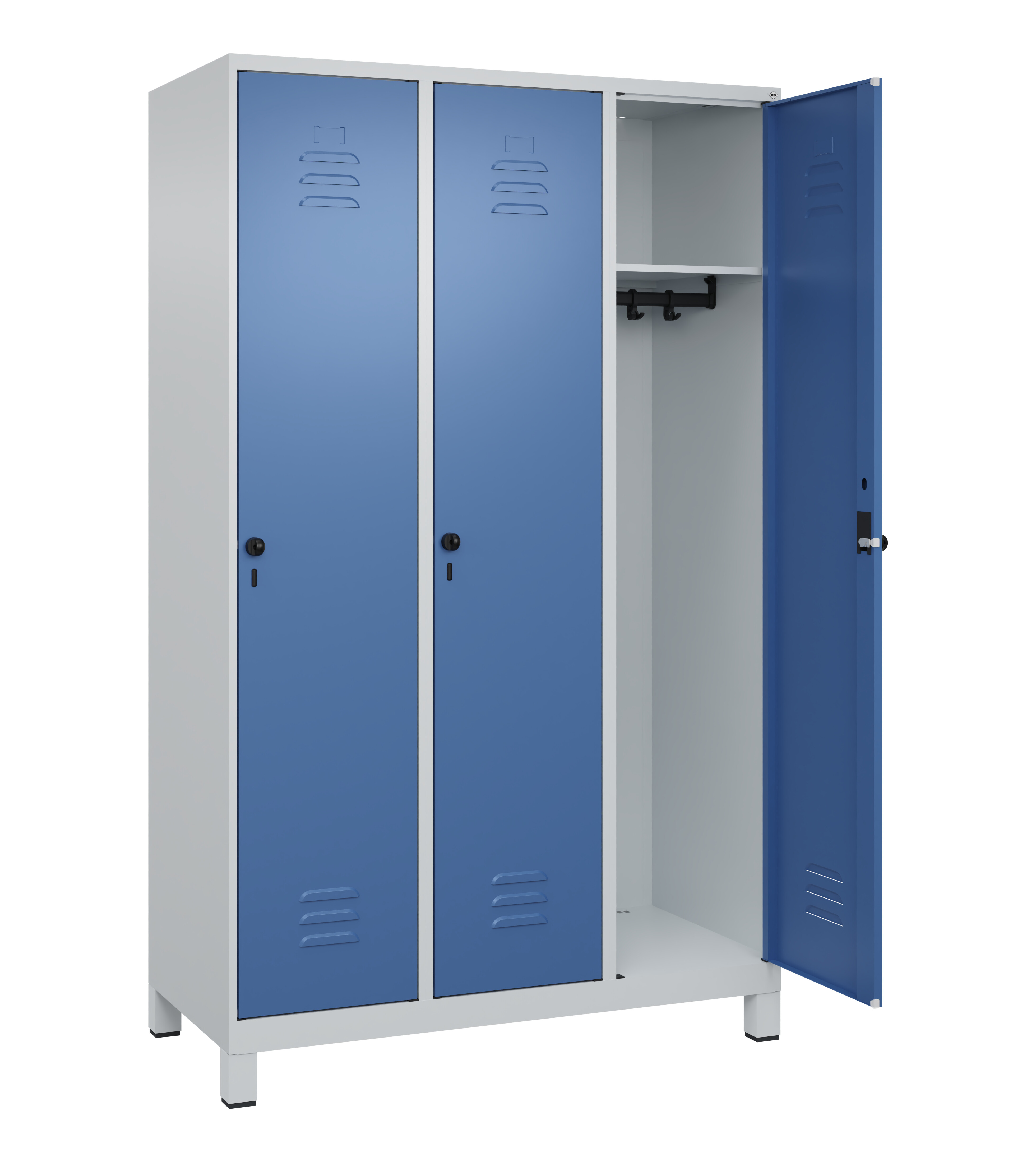 Spind Classic Plus, Füße, 3 Abteile, 1950x1200x500mm RAL 5023 Fernblau RAL 7035 Lichtgrau