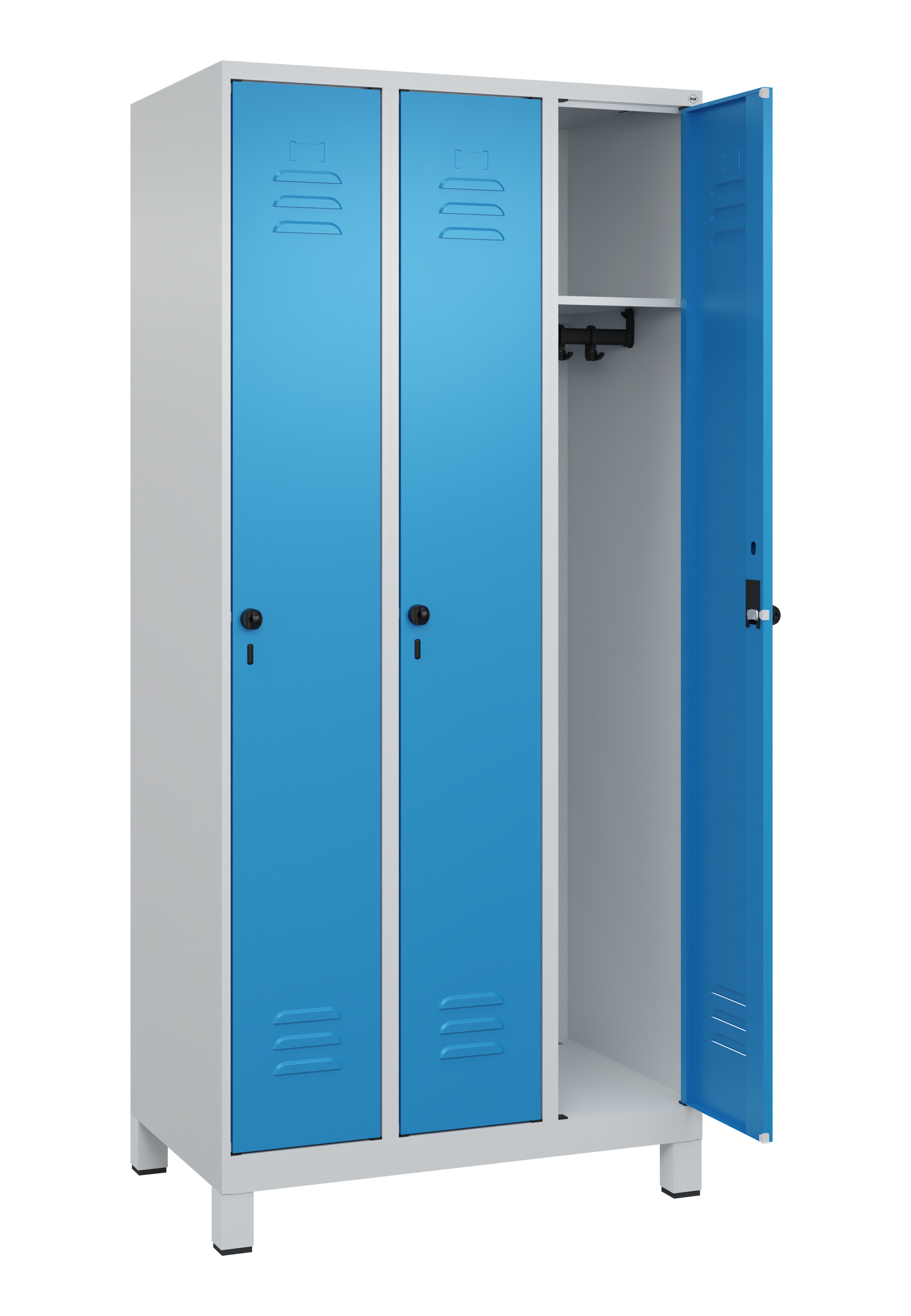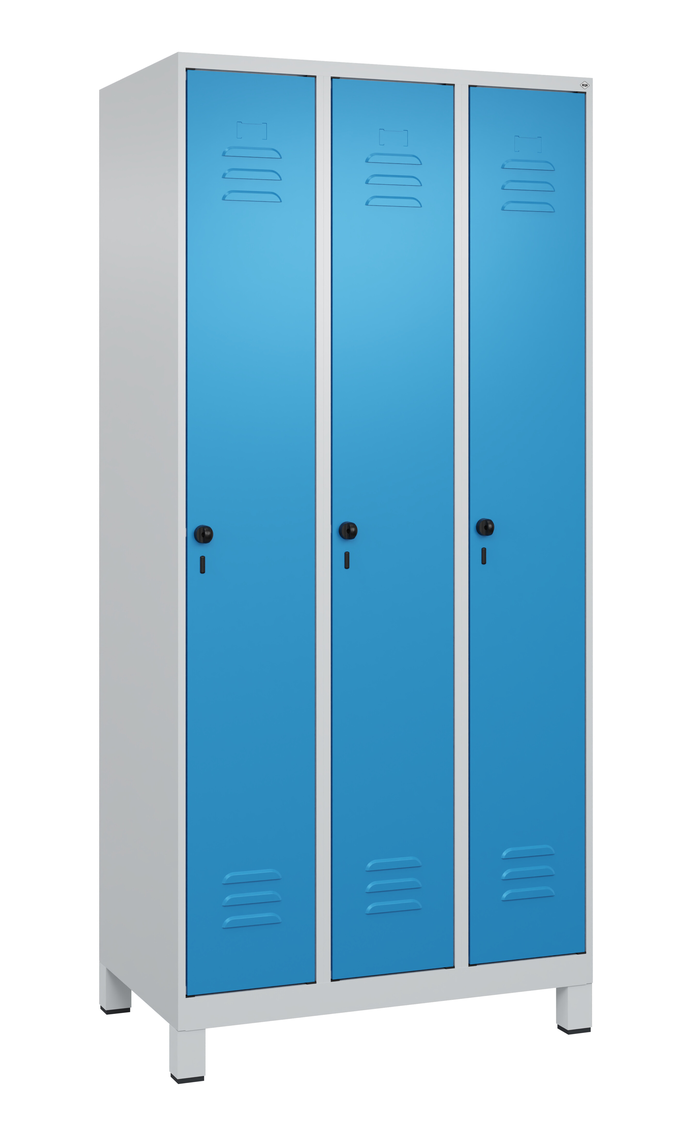 Spind Classic Plus, Füße, 3 Abteile, 1950x900x500mm RAL 5012 Lichtblau RAL 7035 Lichtgrau