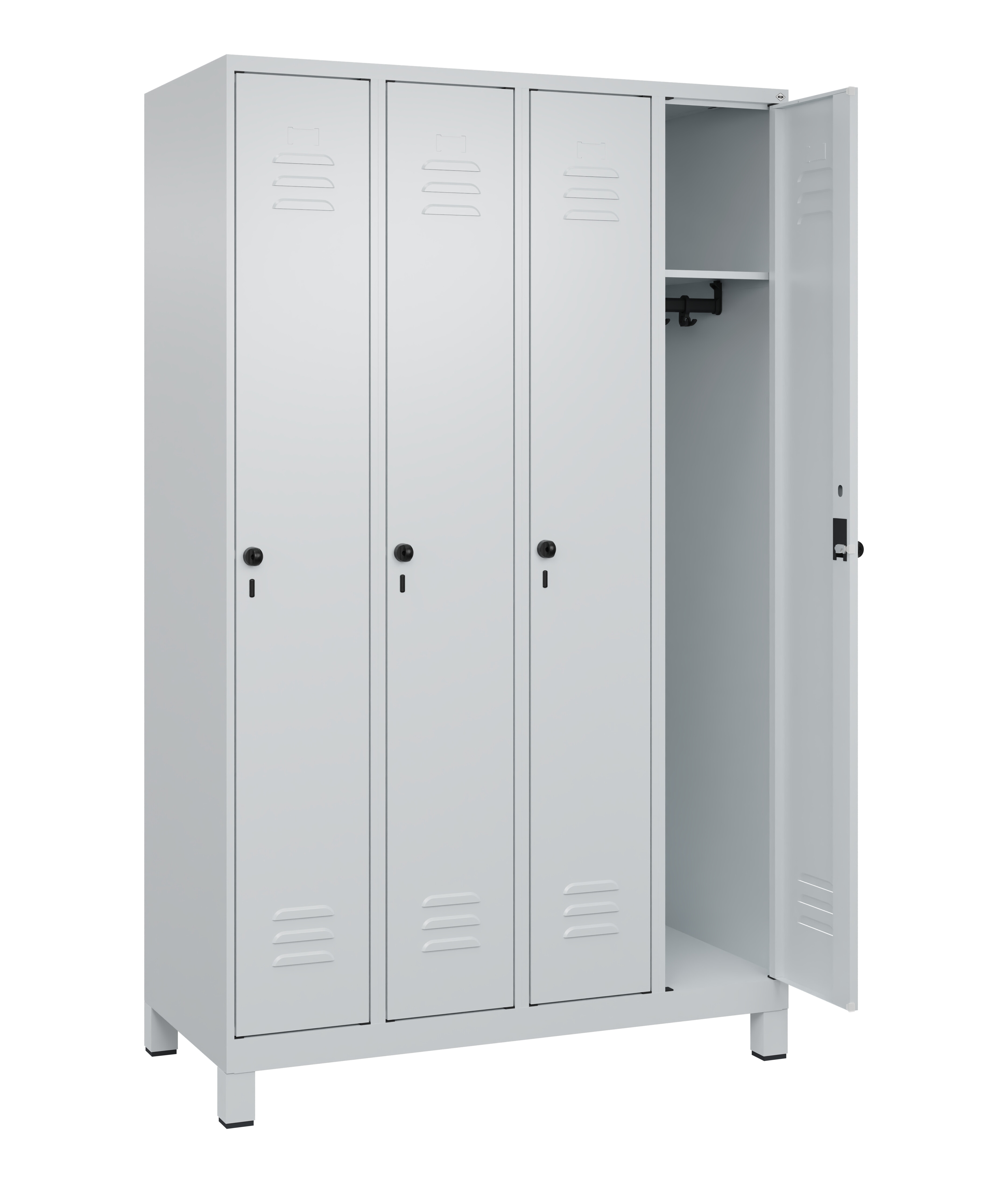Spind Classic PLUS, 4 Abteile, Abteilbreite 300 mm, Korpus aus stabiler Stahlkonstruktion mit hochwertiger Einbrennbeschichtung für hohe UV- und Korrosionsbeständigkeit, mit hinteren Belüftungsöffnungen oben und unten, innen je Abteil 1 Ablageboden, darunter 1 stabile Garderobenstange aus Ovalprofil mit 3 verdrehsicheren Doppel-Schiebehaken inkl. Systemaufnahme, Türöffnungen 110 Grad, Türaufhängung rechts, Stahl-Türen mit Soft-Anschlag und geschlossenen Seitenprofilen für hohe Stabilität, mit Lüftungskiemen oben und unten sowie eingestanztem Etikettenrahmen, Türaufhängung in stabilen Drehbolzen, 4 Ergonomische Sicherheits-Drehriegel für Vorhangschlösser mit Bügelstärke 6 bis 8 mm, inkl. Tür-Schutz, 100 mm hohe Füße aus Kunststoff für erweiterten Korrosionsschutz, Maße (H x B x T): 1950 x 1200 x 500 mm, Korpus: RAL 7035 Lichtgrau, Türen Stahl: RAL 7035 Lichtgrau, Füße: RAL 7035 Lichtgrau, Gewicht: 63 kg