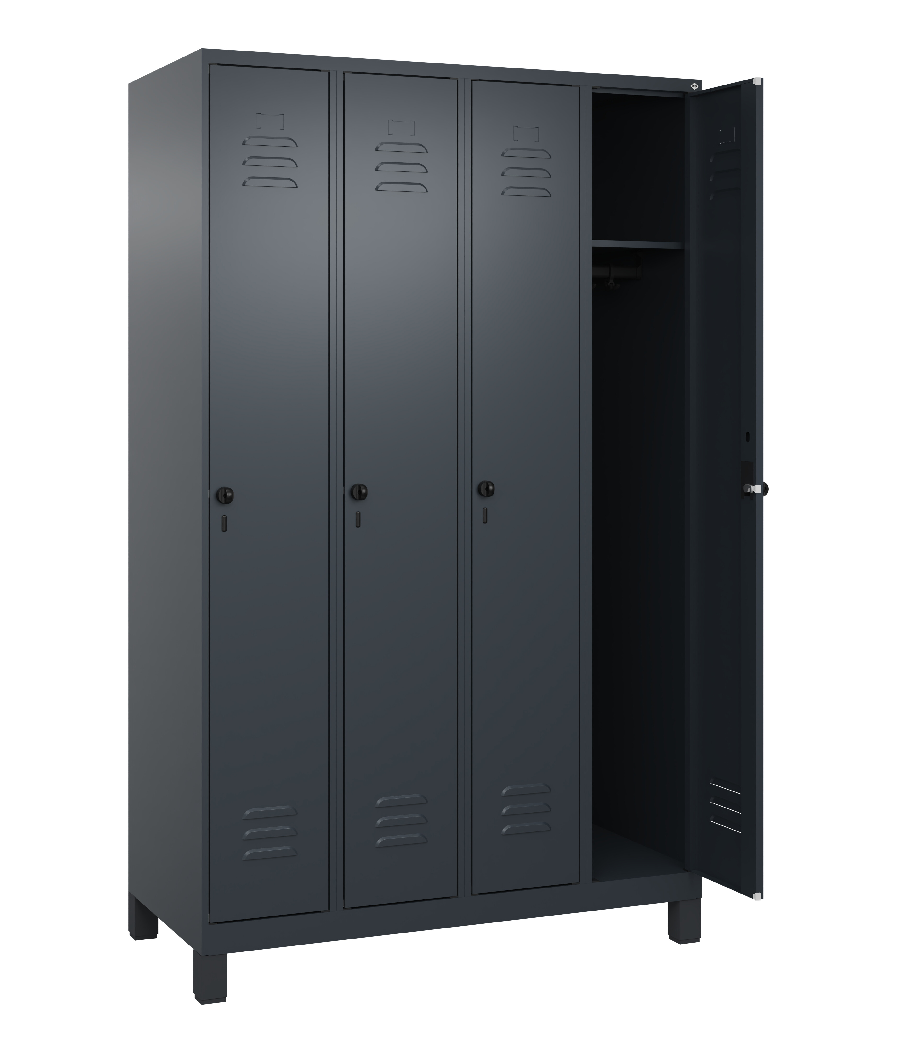 Spind Classic PLUS, 4 Abteile, Abteilbreite 300 mm, Korpus aus stabiler Stahlkonstruktion mit hochwertiger Einbrennbeschichtung für hohe UV- und Korrosionsbeständigkeit, mit hinteren Belüftungsöffnungen oben und unten, innen je Abteil 1 Ablageboden, darunter 1 stabile Garderobenstange aus Ovalprofil mit 3 verdrehsicheren Doppel-Schiebehaken inkl. Systemaufnahme, Türöffnungen 110 Grad, Türaufhängung rechts, Stahl-Türen mit Soft-Anschlag und geschlossenen Seitenprofilen für hohe Stabilität, mit Lüftungskiemen oben und unten sowie eingestanztem Etikettenrahmen, Türaufhängung in stabilen Drehbolzen, 4 Ergonomische Sicherheits-Drehriegel für Vorhangschlösser mit Bügelstärke 6 bis 8 mm, inkl. Tür-Schutz, 100 mm hohe Füße aus Kunststoff für erweiterten Korrosionsschutz, Maße (H x B x T): 1950 x 1200 x 500 mm, Korpus: RAL 7016 Anthrazitgrau, Türen Stahl: RAL 7016 Anthrazitgrau, Füße: RAL 7021 Schwarzgrau, Gewicht: 63 kg