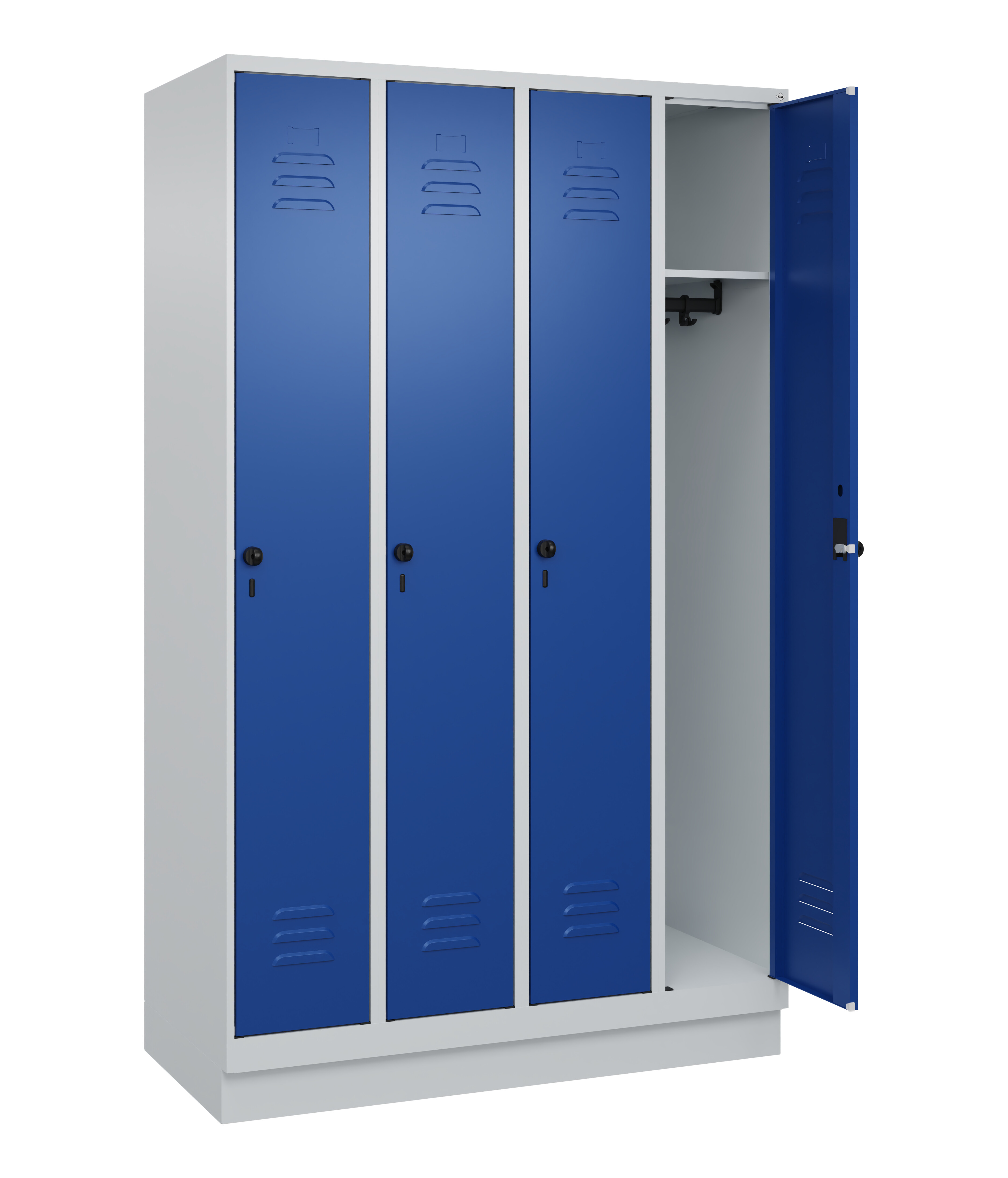 Spind Classic PLUS, 4 Abteile, Abteilbreite 300 mm, Korpus aus stabiler Stahlkonstruktion mit hochwertiger Einbrennbeschichtung für hohe UV- und Korrosionsbeständigkeit, mit hinteren Belüftungsöffnungen oben und unten, innen je Abteil 1 Ablageboden, darunter 1 stabile Garderobenstange aus Ovalprofil mit 3 verdrehsicheren Doppel-Schiebehaken inkl. Systemaufnahme, auf 100 mm hohem Sockel, Türöffnungen 110 Grad, Türaufhängung rechts, Stahl-Türen mit Soft-Anschlag und geschlossenen Seitenprofilen für hohe Stabilität, mit Lüftungskiemen oben und unten sowie eingestanztem Etikettenrahmen, Türaufhängung in stabilen Drehbolzen, 4 Ergonomische Sicherheits-Drehriegel für Vorhangschlösser mit Bügelstärke 6 bis 8 mm, inkl. Tür-Schutz, Maße (H x B x T): 1950 x 1200 x 500 mm, Korpus: RAL 7035 Lichtgrau, Türen Stahl: RAL 5010 Enzianblau, Sockel: RAL 7035 Lichtgrau, Gewicht: 66 kg
