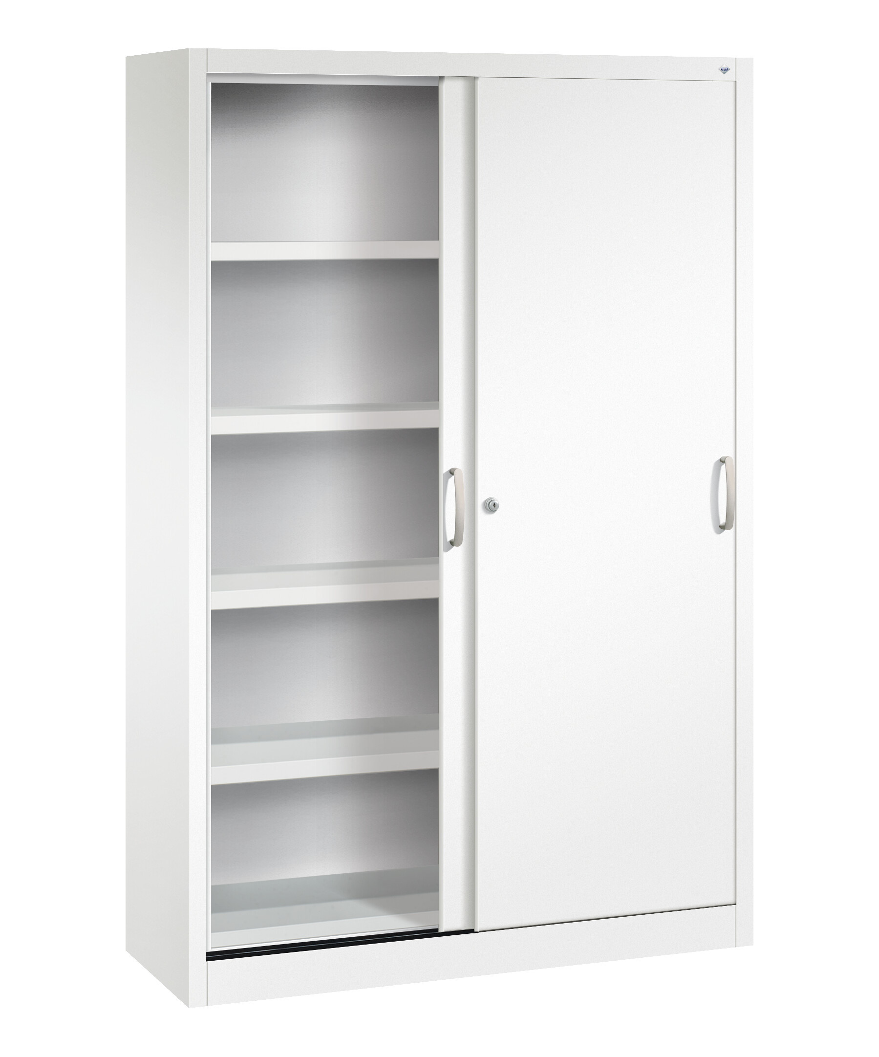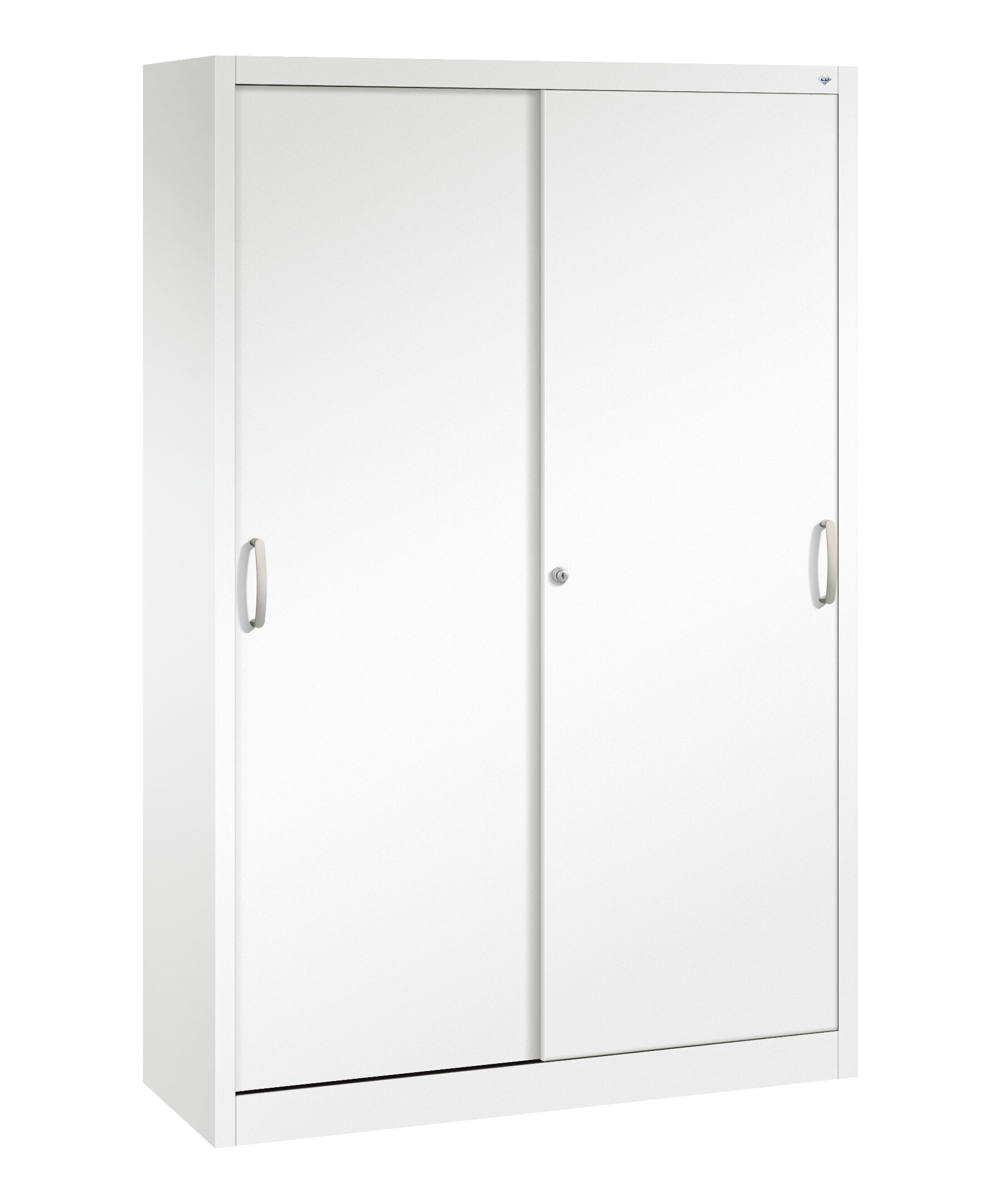 Stahl-Schiebetürenschrank Sport, als Sportgeräteschrank, Korpus aus stabiler Stahlkonstruktion mit hochwertiger Einbrennbeschichtung für hohe UV-Beständigkeit, mit Kunststoffgleitern als praktischer Schrank- und Fußbodenschutz, hohe Flexibilität der Inneneinrichtung durch Höhenverstellbarkeit im 15 mm Raster, Türen verstärkt für hohe Stabilität, leichtgängige Bedienung durch Leichtlaufrollen in spezieller Schienenführung, 2 Ergonomische Bügelgriffe Ergolock aus Metall für einfache Bedienung, matt vernickelt, 4 Einlegeböden aus Stahl, lackiert, mit vorderer Aufkantung als praktische Abrollsicherung und hoher Traglast von 70 kg, 1 Wechselzylinder matt vernickelt mit 2 Schlüsseln, Maße (H x B x T): 1950 x 1200 x 400 mm, Korpus: RAL 9016 Verkehrsweiß, Türen: RAL 9016 Verkehrsweiß, Inneneinrichtung: RAL 7035 Lichtgrau, Gewicht: 59 kg