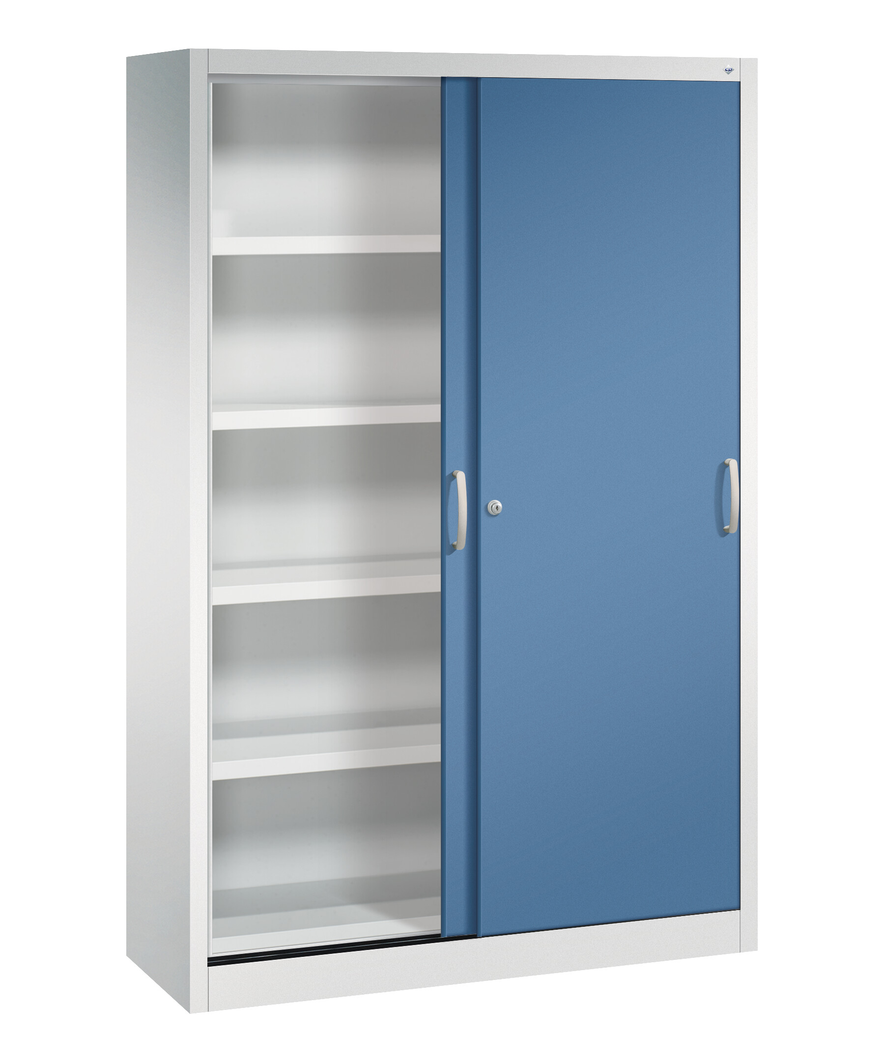 Stahl-Schiebetürenschrank Sport, als Sportgeräteschrank, Korpus aus stabiler Stahlkonstruktion mit hochwertiger Einbrennbeschichtung für hohe UV-Beständigkeit, mit Kunststoffgleitern als praktischer Schrank- und Fußbodenschutz, hohe Flexibilität der Inneneinrichtung durch Höhenverstellbarkeit im 15 mm Raster, Türen verstärkt für hohe Stabilität, leichtgängige Bedienung durch Leichtlaufrollen in spezieller Schienenführung, 2 Ergonomische Bügelgriffe Ergolock aus Metall für einfache Bedienung, matt vernickelt, 4 Einlegeböden aus Stahl, lackiert, mit vorderer Aufkantung als praktische Abrollsicherung und hoher Traglast von 70 kg, 1 Wechselzylinder matt vernickelt mit 2 Schlüsseln, Maße (H x B x T): 1950 x 1200 x 400 mm, Korpus: RAL 7035 Lichtgrau, Türen: RAL 5012 Lichtblau, Inneneinrichtung: RAL 7035 Lichtgrau, Gewicht: 59 kgProduktvorteile:Hohe Flexibilität der Inneneinrichtung durch Verstellbarkeit im 15-mm-RasterHohe Traglast des Einlegebodens von 70 kg für flexible NutzungAbrollsicher durch vordere AufkantungSchiebetüren mit langlebigen Leichtlaufrollen für beste Laufeigenschaften und komfortable BedienungAusführung mit Schiebetüren für reduzierten Flächenbedarf des Schrankes