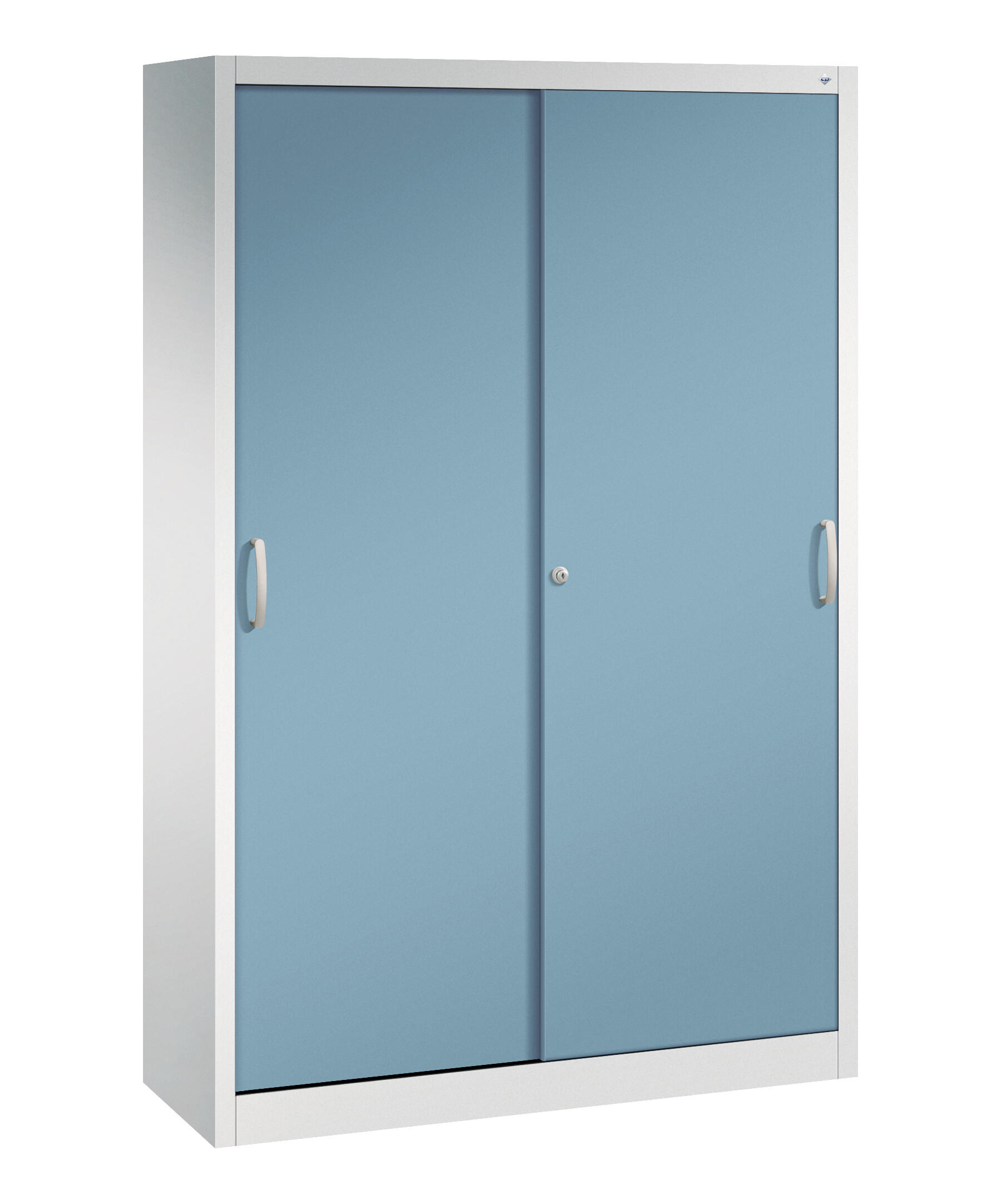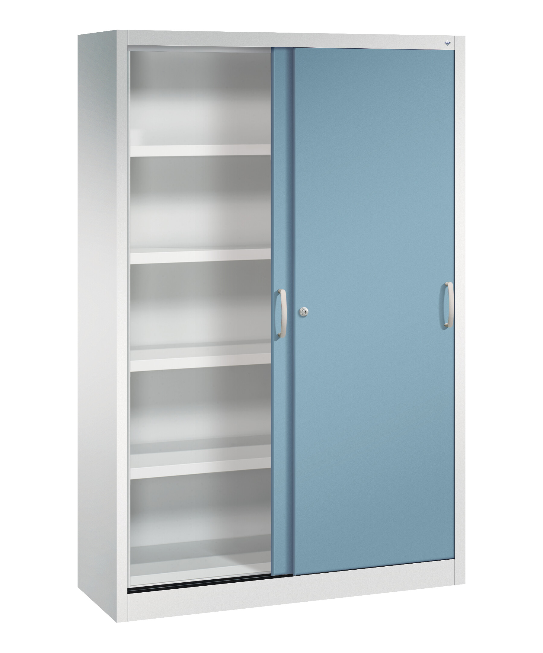 Stahl-Schiebetürenschrank Sport, als Sportgeräteschrank, Korpus aus stabiler Stahlkonstruktion mit hochwertiger Einbrennbeschichtung für hohe UV-Beständigkeit, mit Kunststoffgleitern als praktischer Schrank- und Fußbodenschutz, hohe Flexibilität der Inneneinrichtung durch Höhenverstellbarkeit im 15 mm Raster, Türen verstärkt für hohe Stabilität, leichtgängige Bedienung durch Leichtlaufrollen in spezieller Schienenführung, 2 Ergonomische Bügelgriffe Ergolock aus Metall für einfache Bedienung, matt vernickelt, 4 Einlegeböden aus Stahl, lackiert, mit vorderer Aufkantung als praktische Abrollsicherung und hoher Traglast von 70 kg, 1 Wechselzylinder matt vernickelt mit 2 Schlüsseln, Maße (H x B x T): 1950 x 1200 x 500 mm, Korpus: RAL 7035 Lichtgrau, Türen: RAL 5023 Fernblau, Inneneinrichtung: RAL 7035 Lichtgrau, Gewicht: 90 kgProduktvorteile:Hohe Flexibilität der Inneneinrichtung durch Verstellbarkeit im 15-mm-RasterHohe Traglast des Einlegebodens von 70 kg für flexible NutzungAbrollsicher durch vordere AufkantungSchiebetüren mit langlebigen Leichtlaufrollen für beste Laufeigenschaften und komfortable BedienungAusführung mit Schiebetüren für reduzierten Flächenbedarf des Schrankes