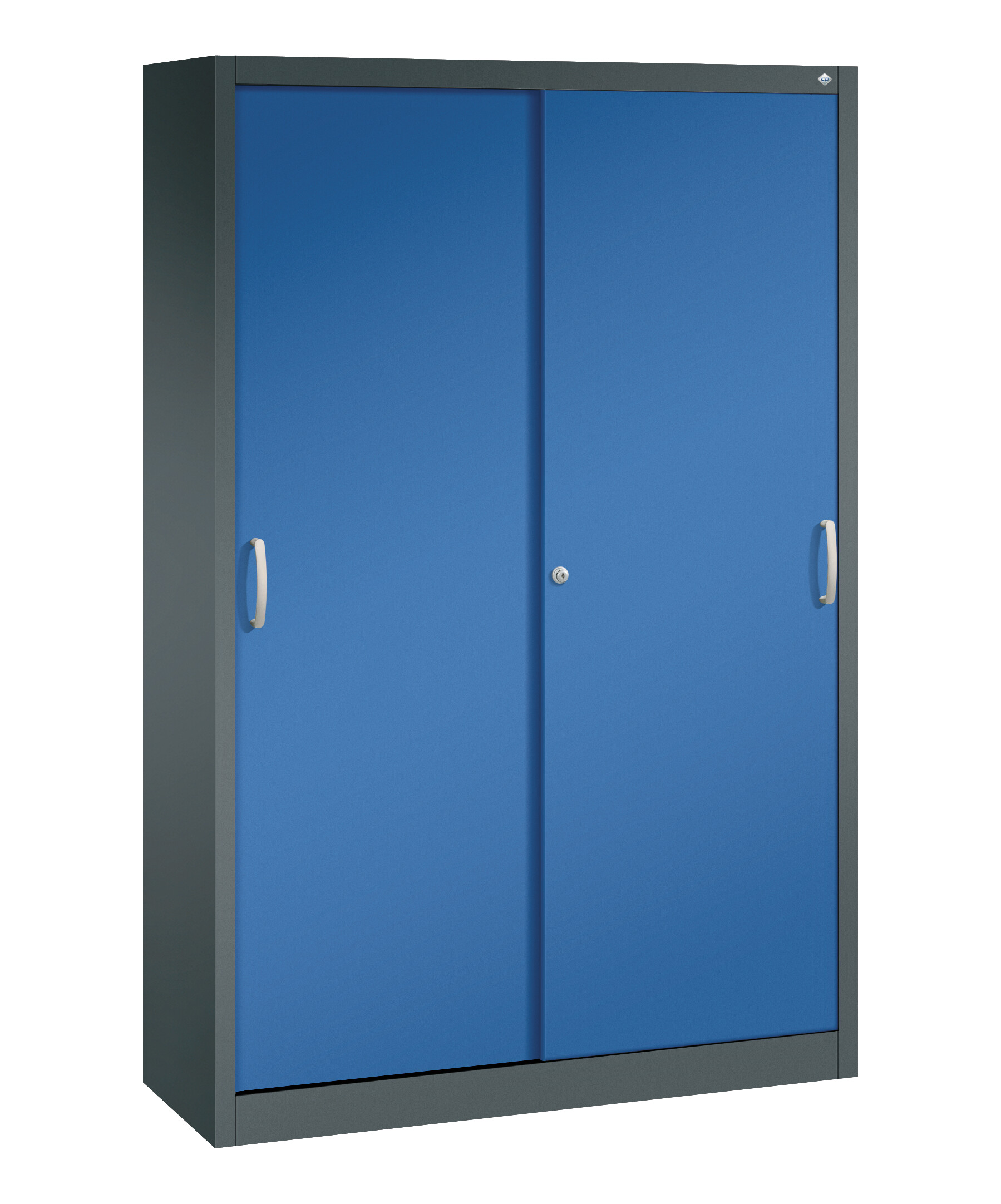 Stahl-Schiebetürenschrank Sport, als Sportgeräteschrank, Korpus aus stabiler Stahlkonstruktion mit hochwertiger Einbrennbeschichtung für hohe UV-Beständigkeit, mit Kunststoffgleitern als praktischer Schrank- und Fußbodenschutz, hohe Flexibilität der Inneneinrichtung durch Höhenverstellbarkeit im 15 mm Raster, Türen verstärkt für hohe Stabilität, leichtgängige Bedienung durch Leichtlaufrollen in spezieller Schienenführung, 2 Ergonomische Bügelgriffe Ergolock aus Metall für einfache Bedienung, matt vernickelt, 4 Einlegeböden aus Stahl, lackiert, mit vorderer Aufkantung als praktische Abrollsicherung und hoher Traglast von 70 kg, 1 Wechselzylinder matt vernickelt mit 2 Schlüsseln, Maße (H x B x T): 1950 x 1200 x 400 mm, Korpus: RAL 7016 Anthrazitgrau, Türen: RAL 5010 Enzianblau, Inneneinrichtung: RAL 7035 Lichtgrau, Gewicht: 59 kg