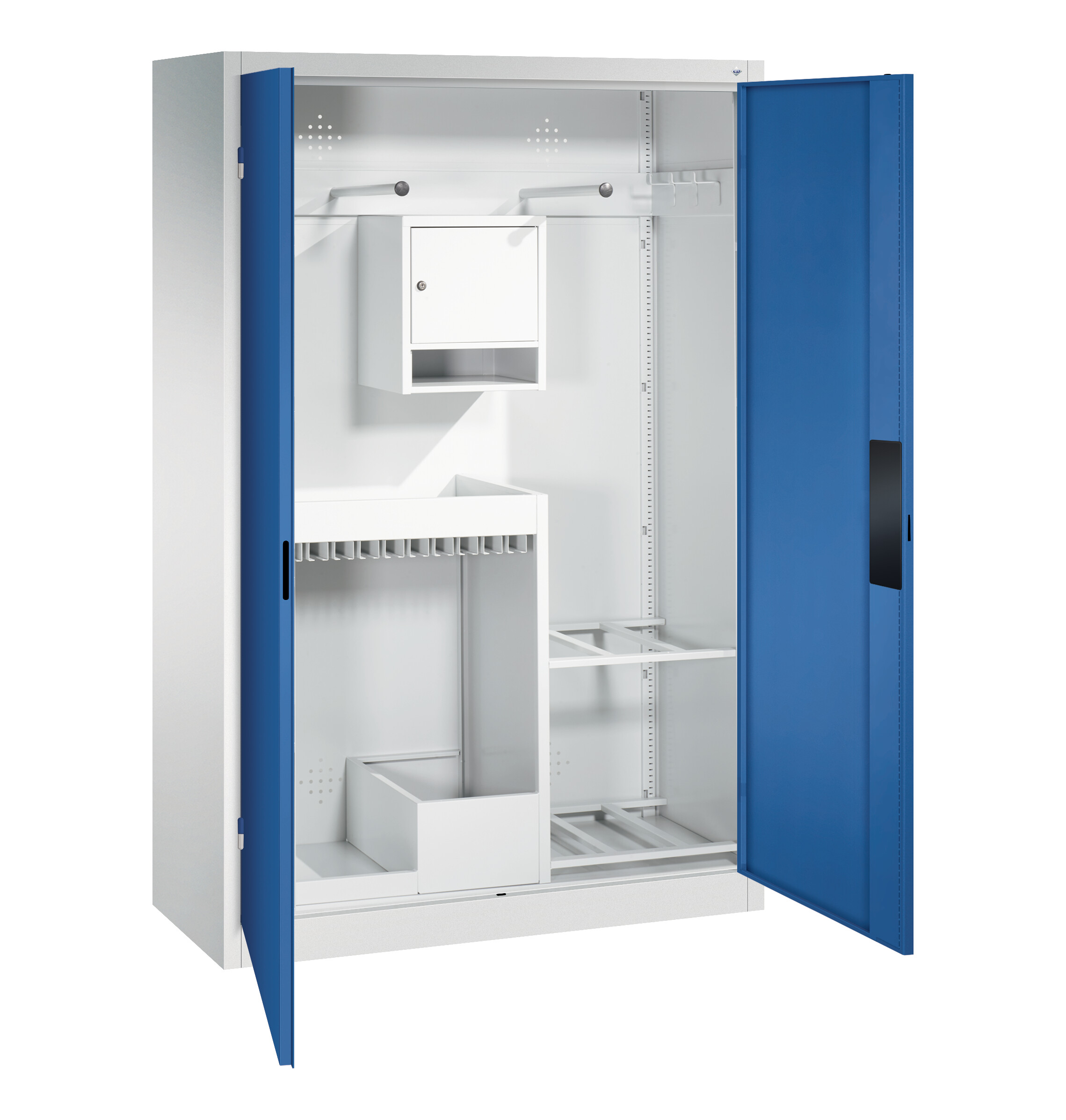 Stahl-Flügeltürenschrank Sport, als Sportgeräteschrank, Korpus aus stabiler Stahlkonstruktion mit hochwertiger Einbrennbeschichtung für hohe UV-Beständigkeit, mit Kunststoffgleitern als praktischer Schrank- und Fußbodenschutz, Rückwand mit Belüftungsöffungen, Türen verstärkt für hohe Stabilität, verdeckte Schließstangen, Türaufhängung oben und unten in außen liegenden Scharnieren mit großzügigem Öffnungswinkel ca. 180 Grad, zueinanderschlagend für gemeinsamen Verschluss, oben mittig Rückwandtraverse mit Reifenhalter, darunter Wertfach mit Zylinderschloss sowie offener Ablage, oben rechts Seitenwandtraverse mit 3 Haken z.B. als Seilhalter, unten rechts Gymnastikstangenhalter mit Trennstegen, links Modulkasten mit Ablagewannen und Turnkeulenhalter, Tür verstärkt für hohe Stabilität, Türaufhängung in außen liegenden Scharnieren mit großzügigem Öffnungswinkel ca. 180 Grad, 1 Ergonomischer Muldengriff Ergo-Lock 4.0 für optimale Bedienungssicherheit und Verschleißfestigkeit, 3-Riegel-Verschluss, mit Zylinderschloss und 2 Schlüsseln, Maße (H x B x T): 1950 x 1200 x 500 mm, Korpus: RAL 7035 Lichtgrau, Türen: RAL 5010 Enzianblau, Gewicht: 88 kg