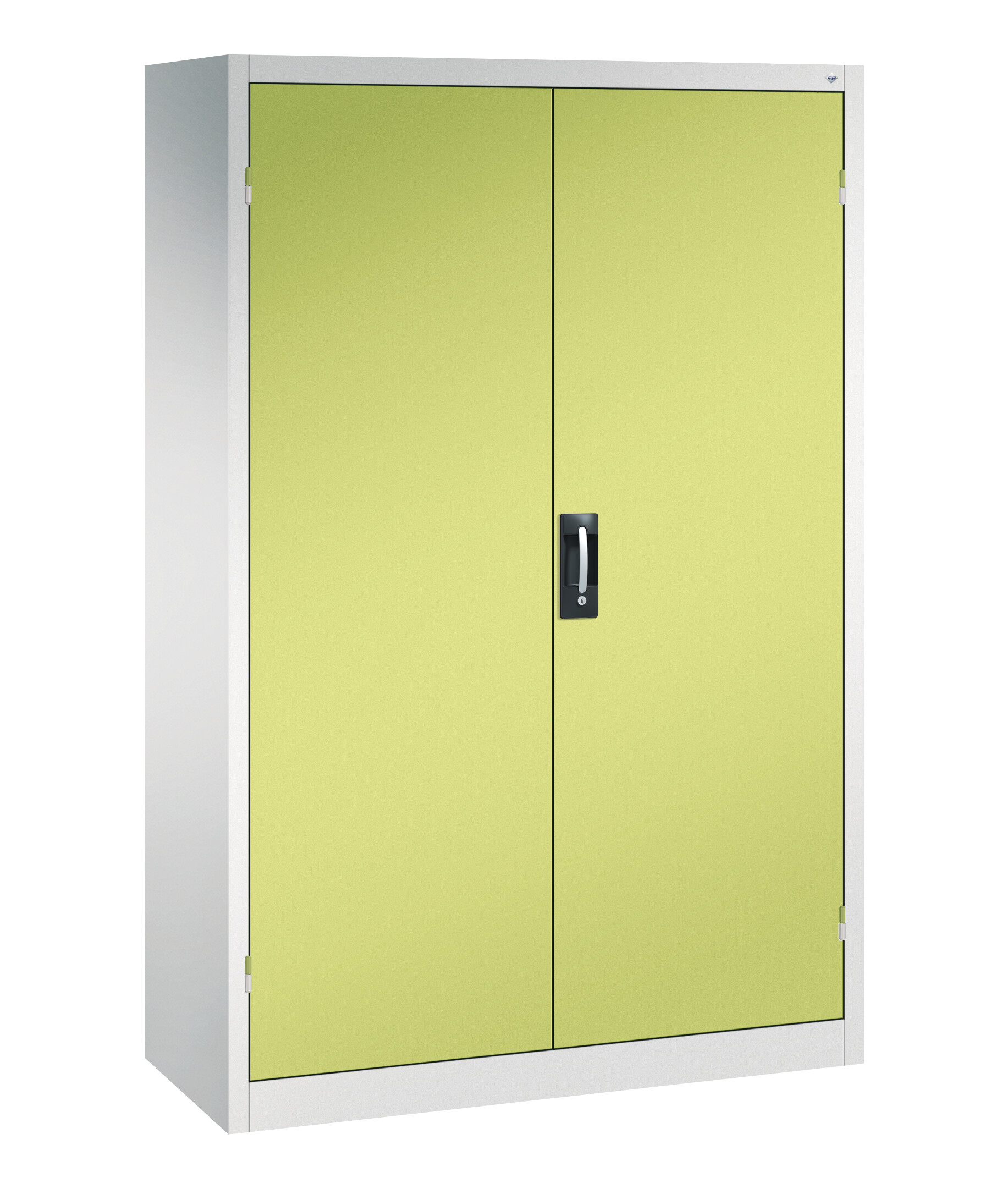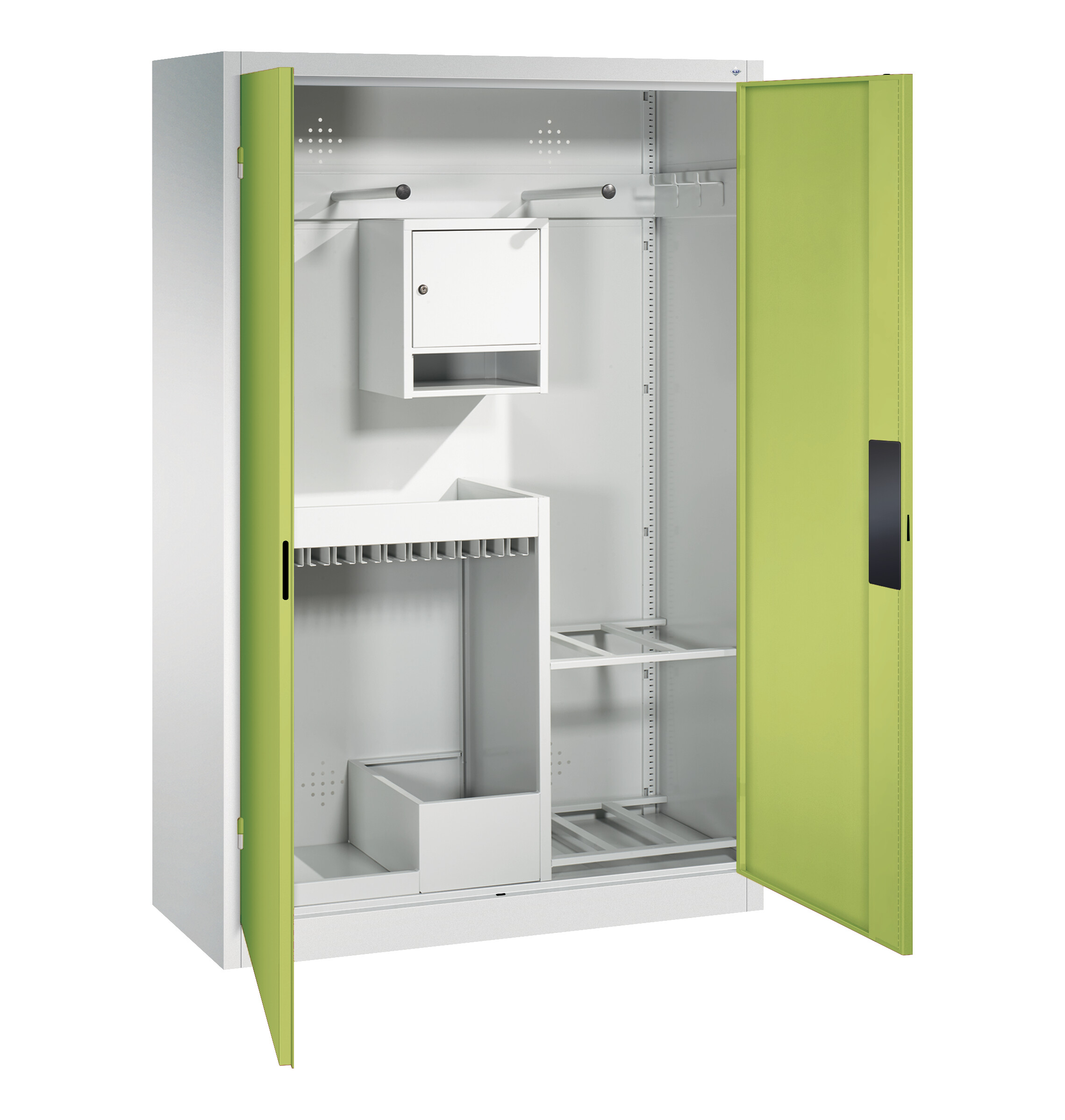Stahl-Flügeltürenschrank Sport, als Sportgeräteschrank, Korpus aus stabiler Stahlkonstruktion mit hochwertiger Einbrennbeschichtung für hohe UV-Beständigkeit, mit Kunststoffgleitern als praktischer Schrank- und Fußbodenschutz, Rückwand mit Belüftungsöffungen, Türen verstärkt für hohe Stabilität, verdeckte Schließstangen, Türaufhängung oben und unten in außen liegenden Scharnieren mit großzügigem Öffnungswinkel ca. 180 Grad, zueinanderschlagend für gemeinsamen Verschluss, oben mittig Rückwandtraverse mit Reifenhalter, darunter Wertfach mit Zylinderschloss sowie offener Ablage, oben rechts Seitenwandtraverse mit 3 Haken z.B. als Seilhalter, unten rechts Gymnastikstangenhalter mit Trennstegen, links Modulkasten mit Ablagewannen und Turnkeulenhalter, Tür verstärkt für hohe Stabilität, Türaufhängung in außen liegenden Scharnieren mit großzügigem Öffnungswinkel ca. 180 Grad, 1 Ergonomischer Muldengriff Ergo-Lock 4.0 für optimale Bedienungssicherheit und Verschleißfestigkeit, 3-Riegel-Verschluss, mit Zylinderschloss und 2 Schlüsseln, Maße (H x B x T): 1950 x 1200 x 500 mm, Korpus: RAL 7035 Lichtgrau, Türen: 1108060 RDS Clowngrün, Gewicht: 88 kg